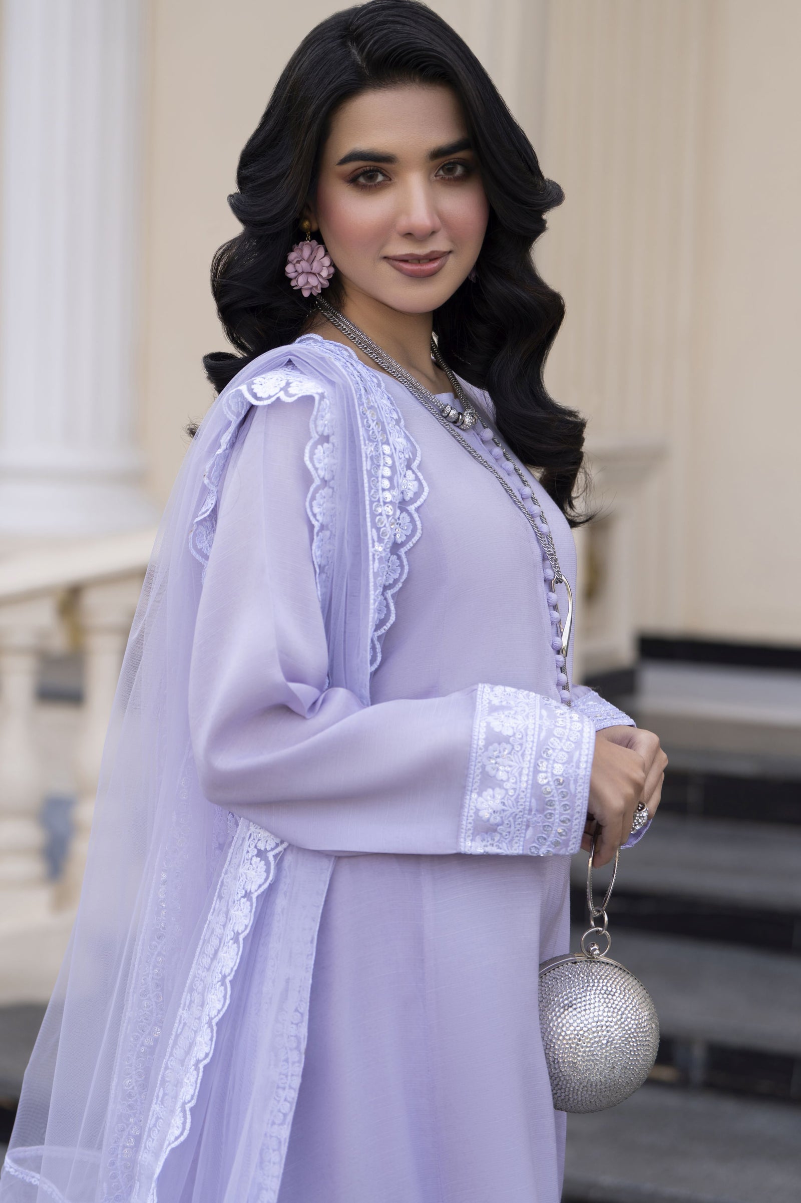 Graceful, feminine, and effortlessly elegant, this 3-piece ready to wear outfit from Aleezay’s Evara Collection is designed for women who love flowing silhouettes with refined detailing. Crafted in premium poly raw silk, this ensemble offers a smooth texture, soft structure, and an elegant fall that enhances its timeless appeal.