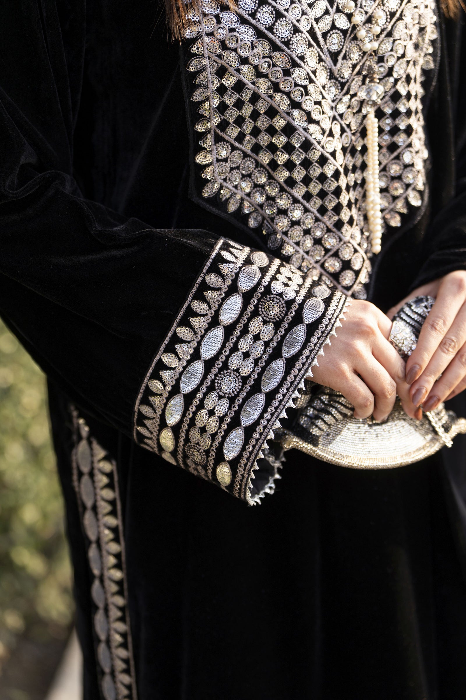 The embroidered long velvet shirt is designed with a graceful fall and paired with matching straight-leg trousers, creating a sleek and flattering silhouette. Completing the ensemble is a luxuriously embroidered velvet shawl, adding warmth, drama, and a couture finish.