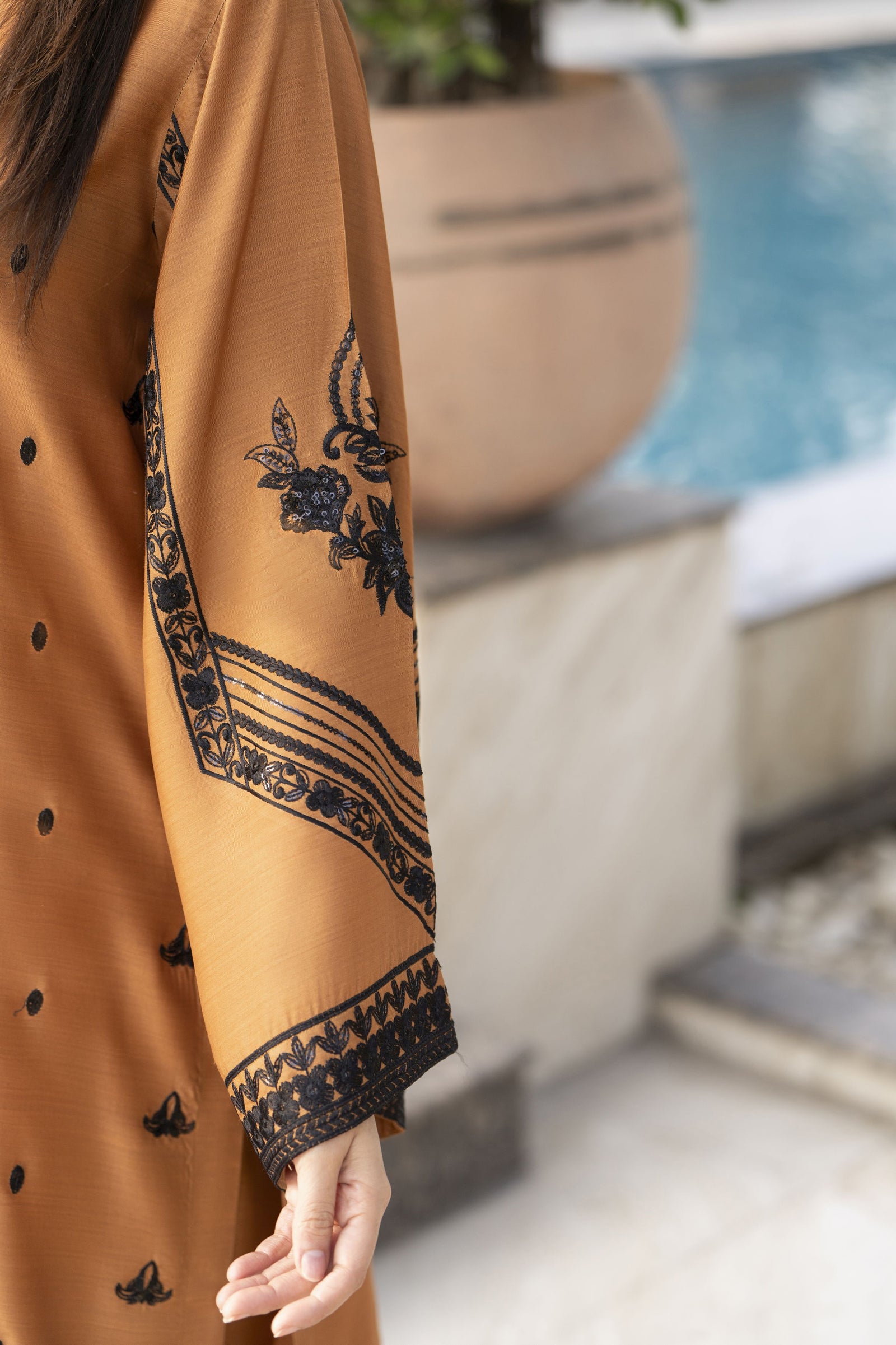 The look is completed with matching embroidered wide-leg trousers, offering a graceful drape and a modern silhouette. Perfect for daytime occasions, casual gatherings, or elevated everyday wear, this piece blends comfort with understated luxury.
