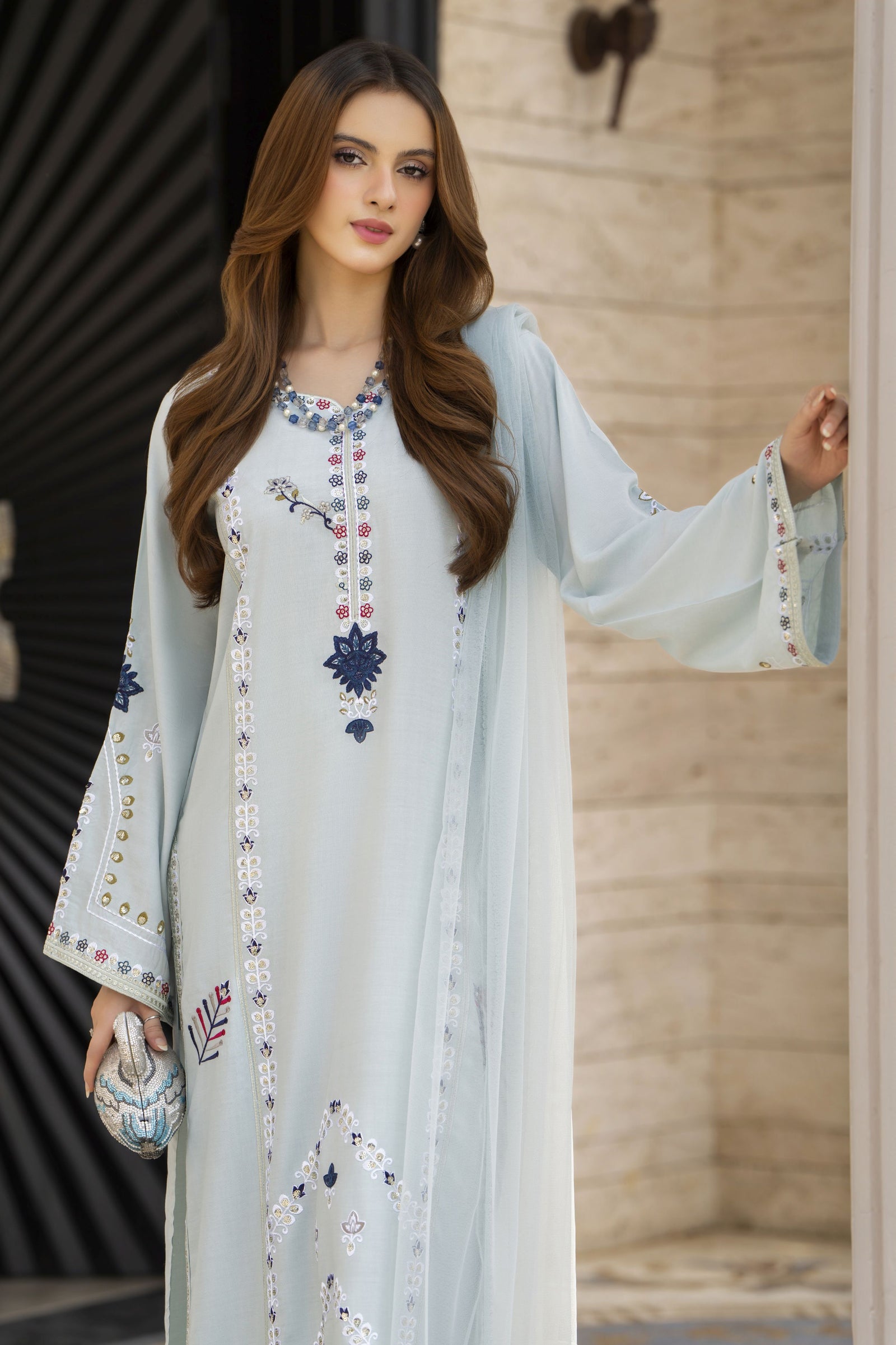 Soft, serene, and effortlessly elegant — this 3-piece embroidered linen outfit from Linen Aura by Miski is the epitome of refined winter charm. Rendered in a delicate ice blue shade, the shirt features intricate multicoloured embroidery across the neckline, sleeves, and hemline, beautifully enhanced with hints of navy and pink threadwork. The wide-cut sleeves add a graceful flow, while the matching straight trousers maintain a polished look. Completing the ensemble is a net dupatta edged with fine lace, lending a feminine finish. Perfect for winter luncheons and casual gatherings, this outfit blends warmth, elegance, and contemporary sophistication in perfect harmony.