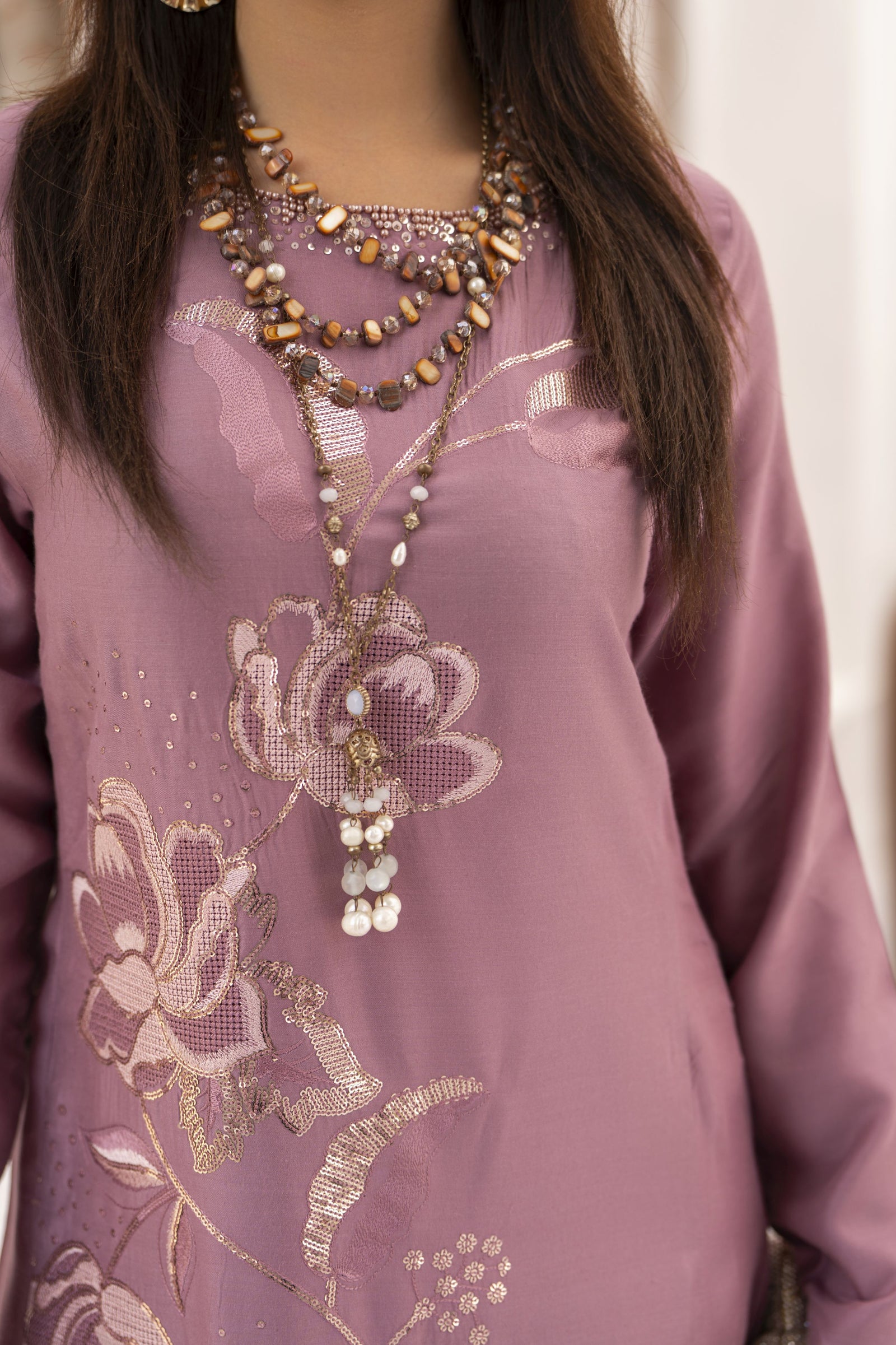 Elevate your winter wardrobe with this elegant mauve kurta from FrostFit by Miski. Crafted from premium winter linen, it features delicate thread and sequins embroidery in soft gold tones, forming a graceful floral composition that adds warmth and sophistication.