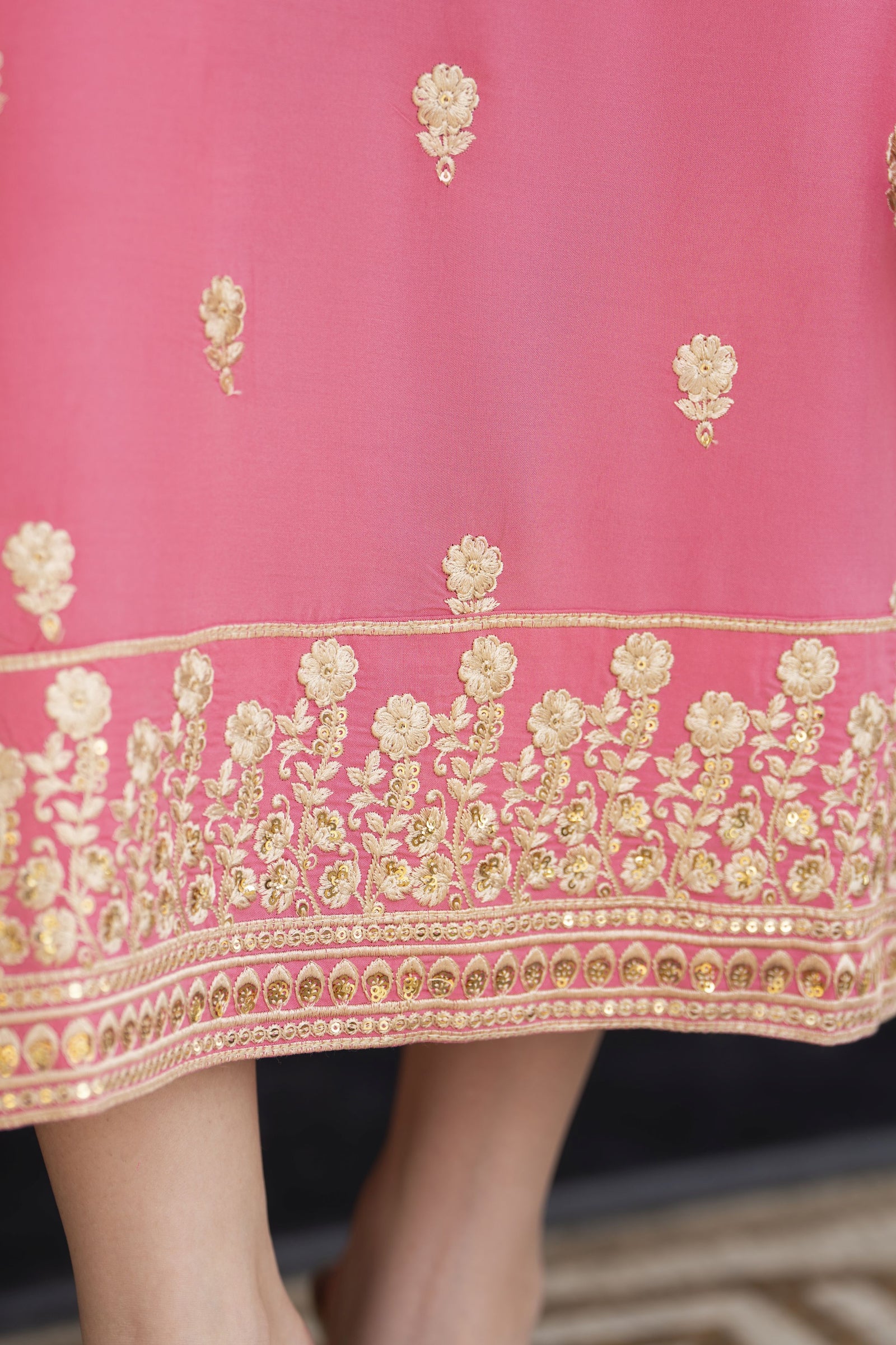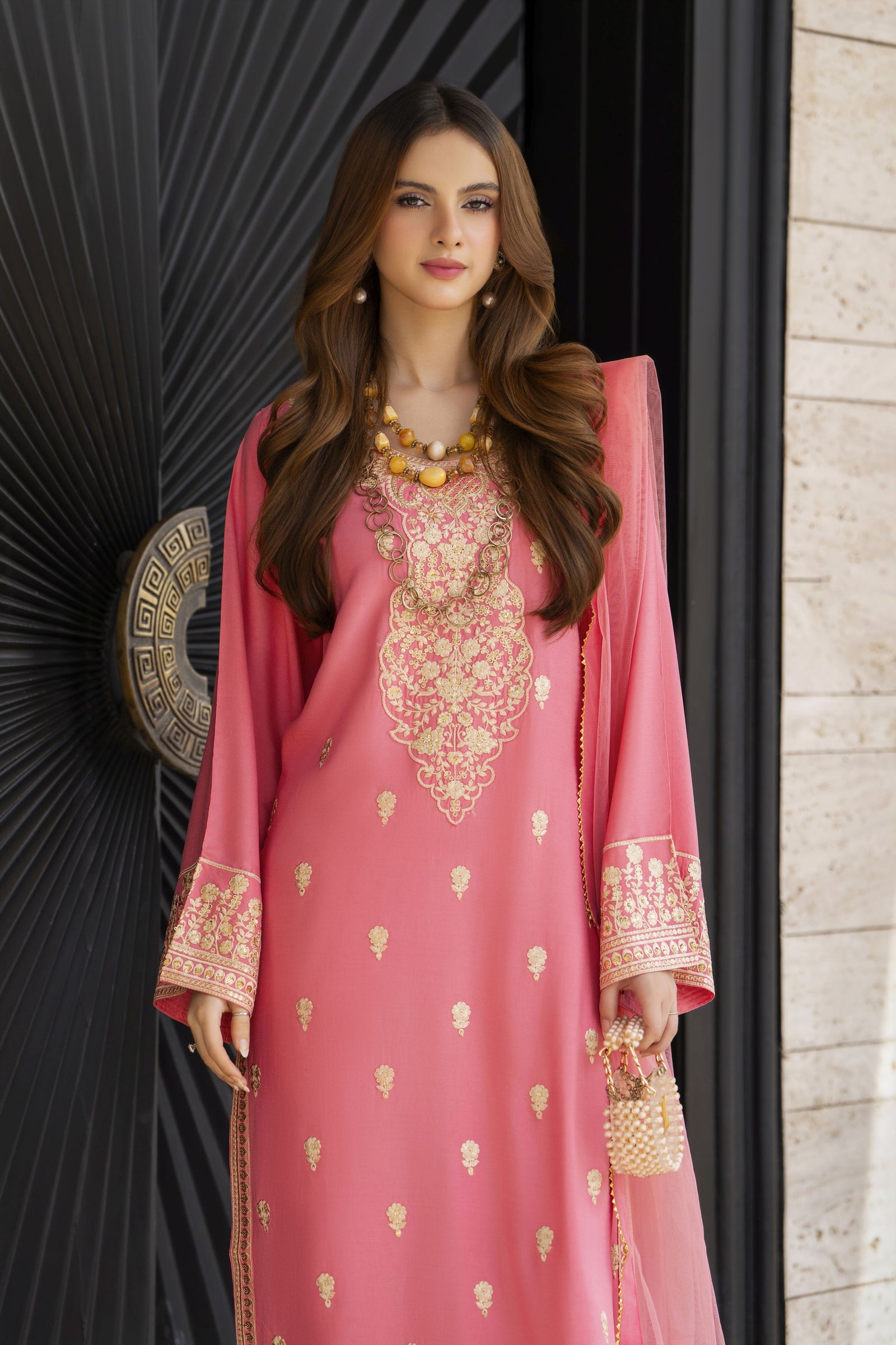 Radiate winter elegance in this exquisite 3-piece embroidered outfit from Linen Aura by Miski. Crafted from fine linen in a soft peach tone, the shirt features intricate gold thread embroidery across the neckline, sleeves, and hem, adding a touch of festive charm. The timeless straight silhouette ensures a graceful fall, perfectly complemented by matching trousers for a refined finish. A net dupatta with delicate lace edging completes the look, exuding lightness and luxury. Designed for the modern woman who values understated sophistication, this ensemble brings warmth, comfort, and effortless beauty to every occasion.