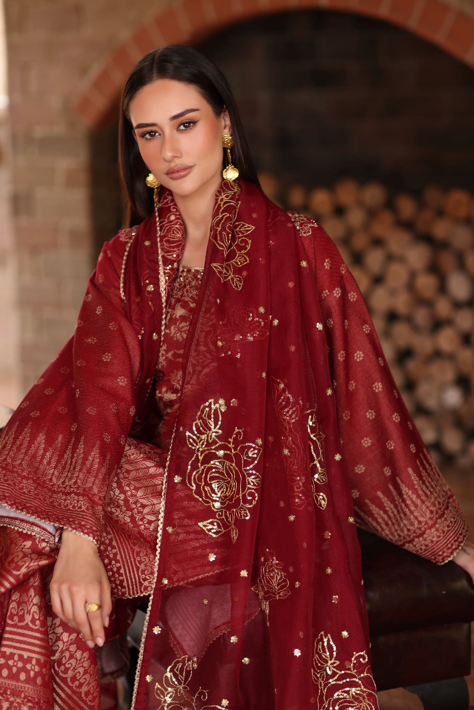 Rich, graceful, and effortlessly elegant, this design from Serene by Mohagni is crafted for women who appreciate refined festive wear with a timeless appeal. Rendered in a luxurious deep maroon tone, the outfit features a dyed jacquard shirt adorned with delicate hand embellishment, adding depth and sophistication to the overall look.