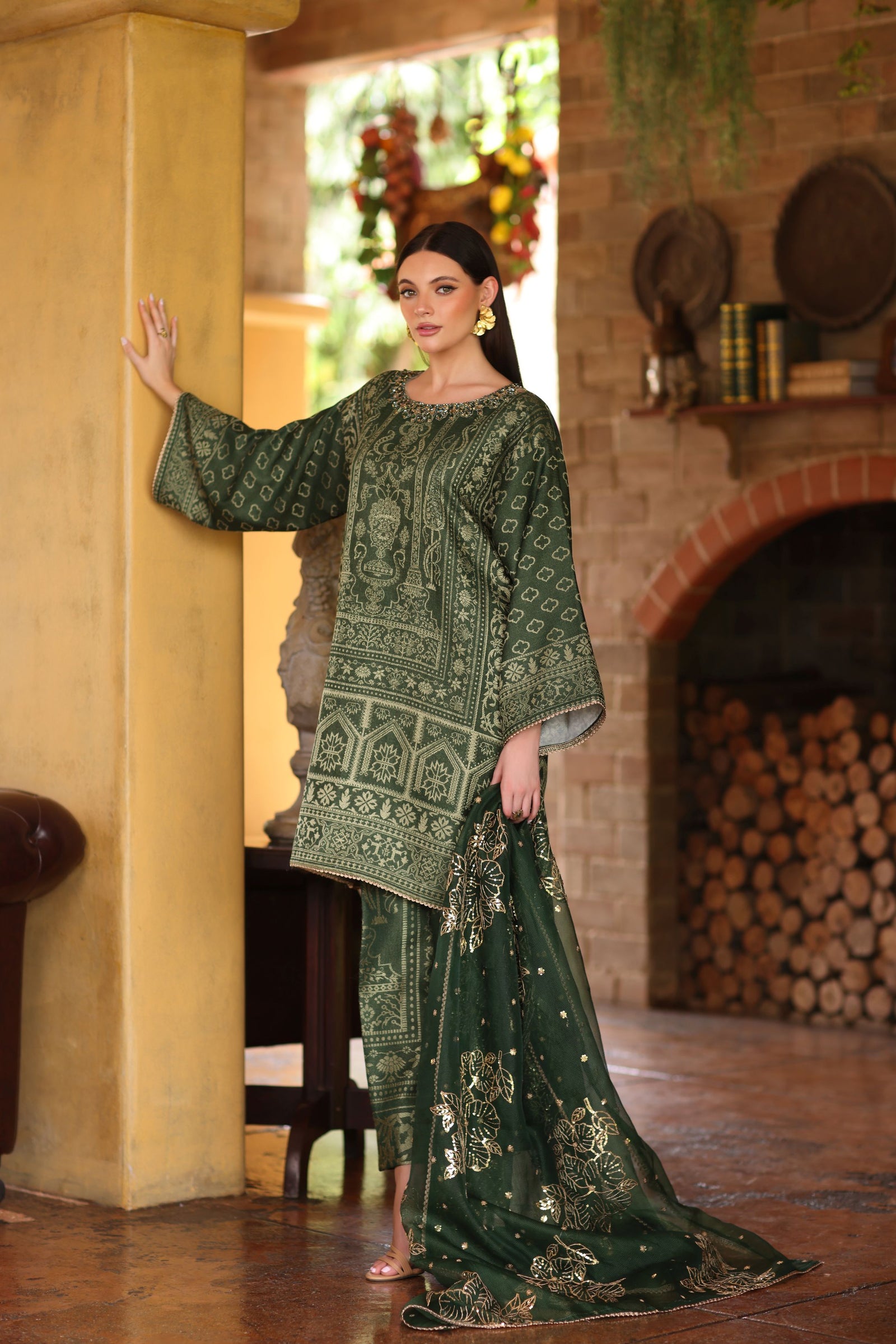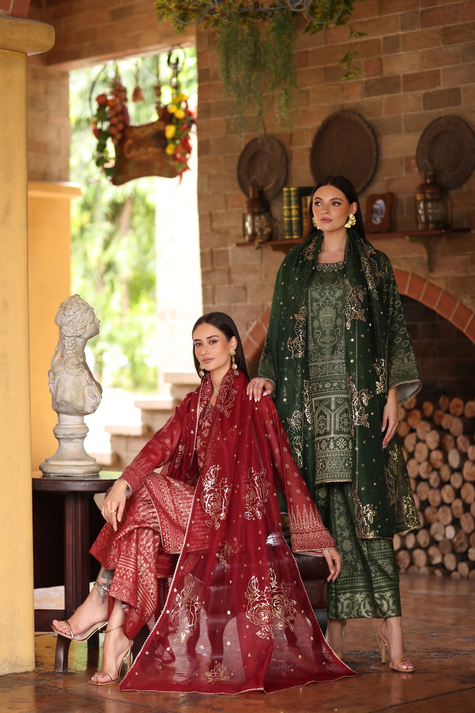 The beautifully textured jacquard shirt is paired with matching dyed jacquard trousers, creating a cohesive and graceful silhouette. Completing the outfit is a dyed polynet dupatta, intricately embroidered to bring softness, movement, and subtle shimmer to the ensemble.