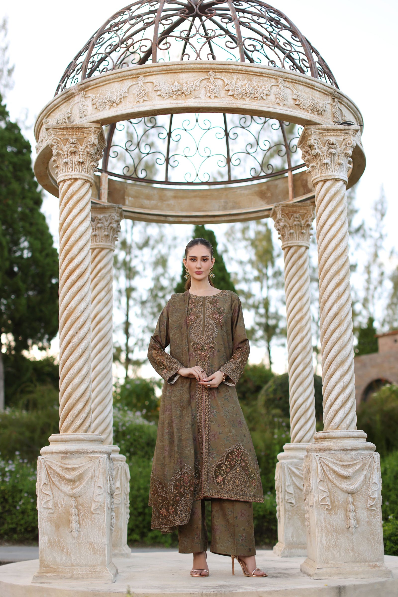 Earthy, graceful, and effortlessly elegant, this design from Serene by Mohagni is created for women who appreciate refined winter wear with subtle detailing. Crafted in a printed blended khaddar fabric, the shirt is enhanced with embroidered patches that add depth and artisanal charm while keeping the overall look understated and wearable.