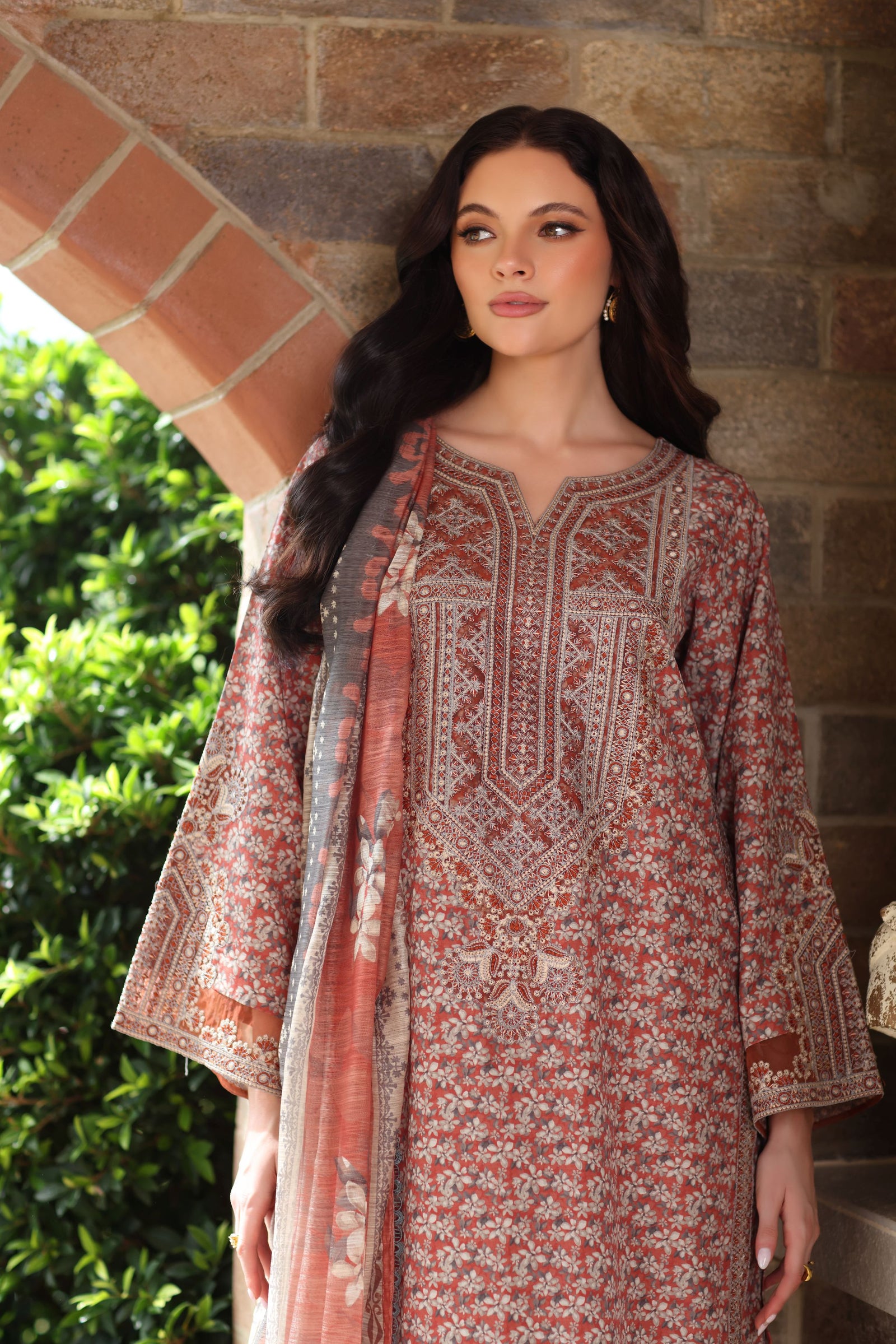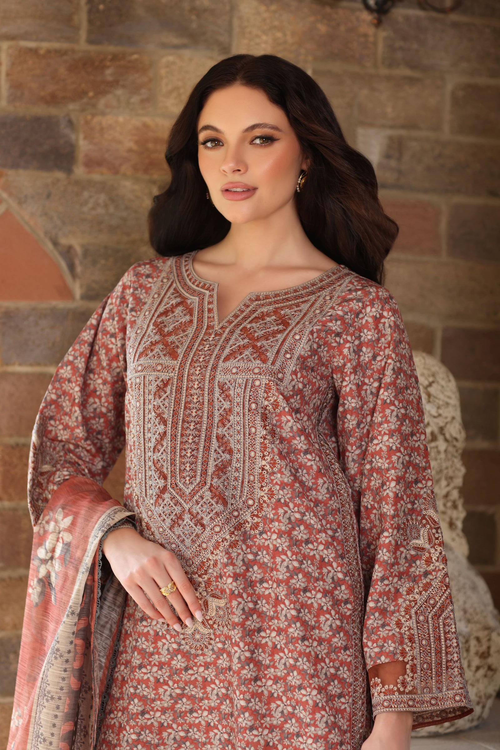 The outfit is paired with a printed blended khaddar plazo trouser, finished with lace detailing that enhances the silhouette with a feminine touch and gentle movement. Completing the look is a coordinated printed dupatta, adding balance and visual harmony to the ensemble.