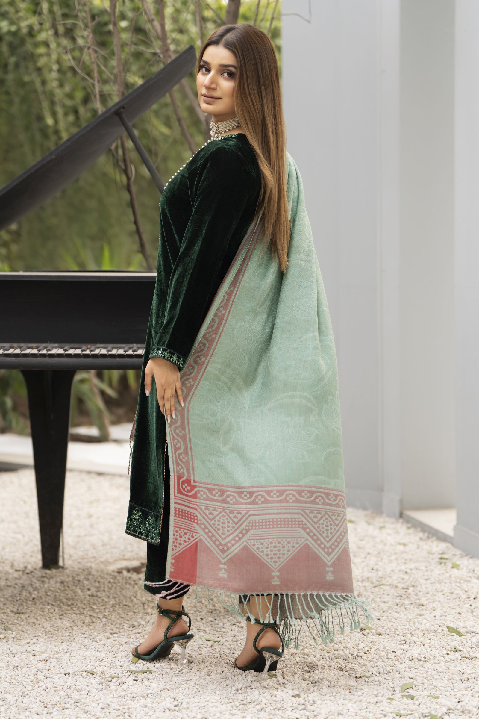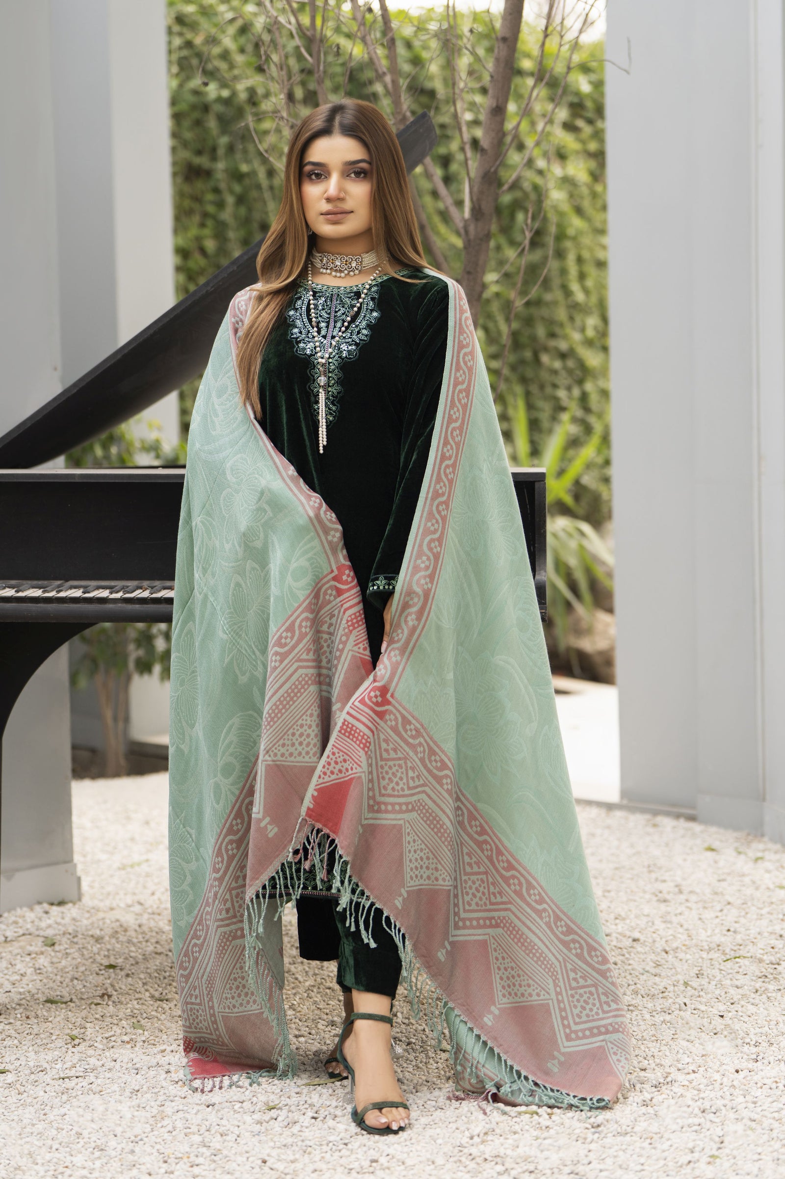 Elegant and effortlessly refined, Mira in Green from the Zaina Plush collection is designed for timeless winter wear. Crafted in rich velvet with delicate embroidery, this ready-to-wear ensemble is complemented by a classic wool jacquard shawl, offering a graceful balance of comfort and luxury.