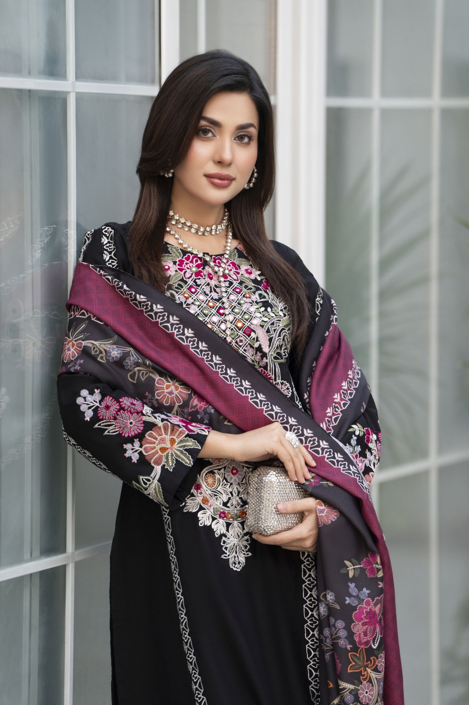 Elevate your winter wardrobe with this beautifully crafted 3-piece ready-to-wear khaddar suit by Zaiwa, designed for women who love timeless elegance with everyday comfort. The long khaddar shirt features intricate embroidery on the front, sleeves, and hem, creating a rich yet wearable look suitable for both casual gatherings and semi-formal winter wear.