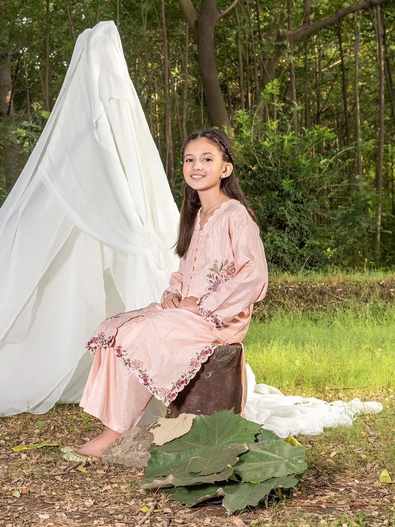 Soft, elegant, and beautifully detailed — this peach 2-piece outfit from the Mini Me by Mona collection is designed to make your little one shine. The premium raw silk shirt features dazzling spangle embroidery, adding a gentle shimmer that enhances its delicate floral design.