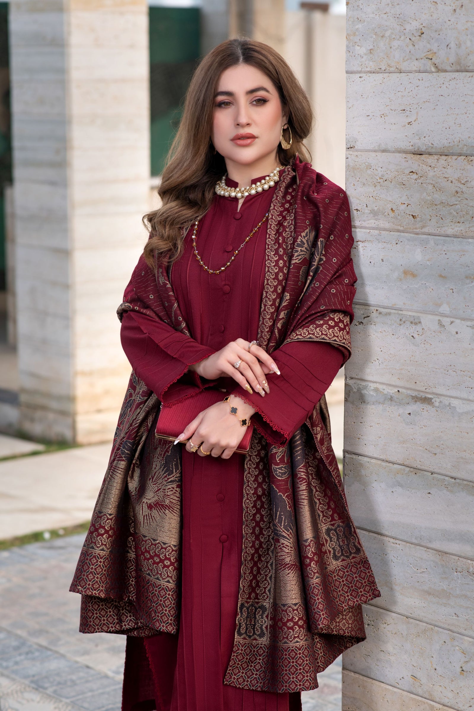 Completing the look is a rich wool Multani jacquard shawl, designed to add both warmth and visual depth. The traditional woven pattern brings a heritage touch, making this outfit perfect for winter days that flow into evening gatherings.