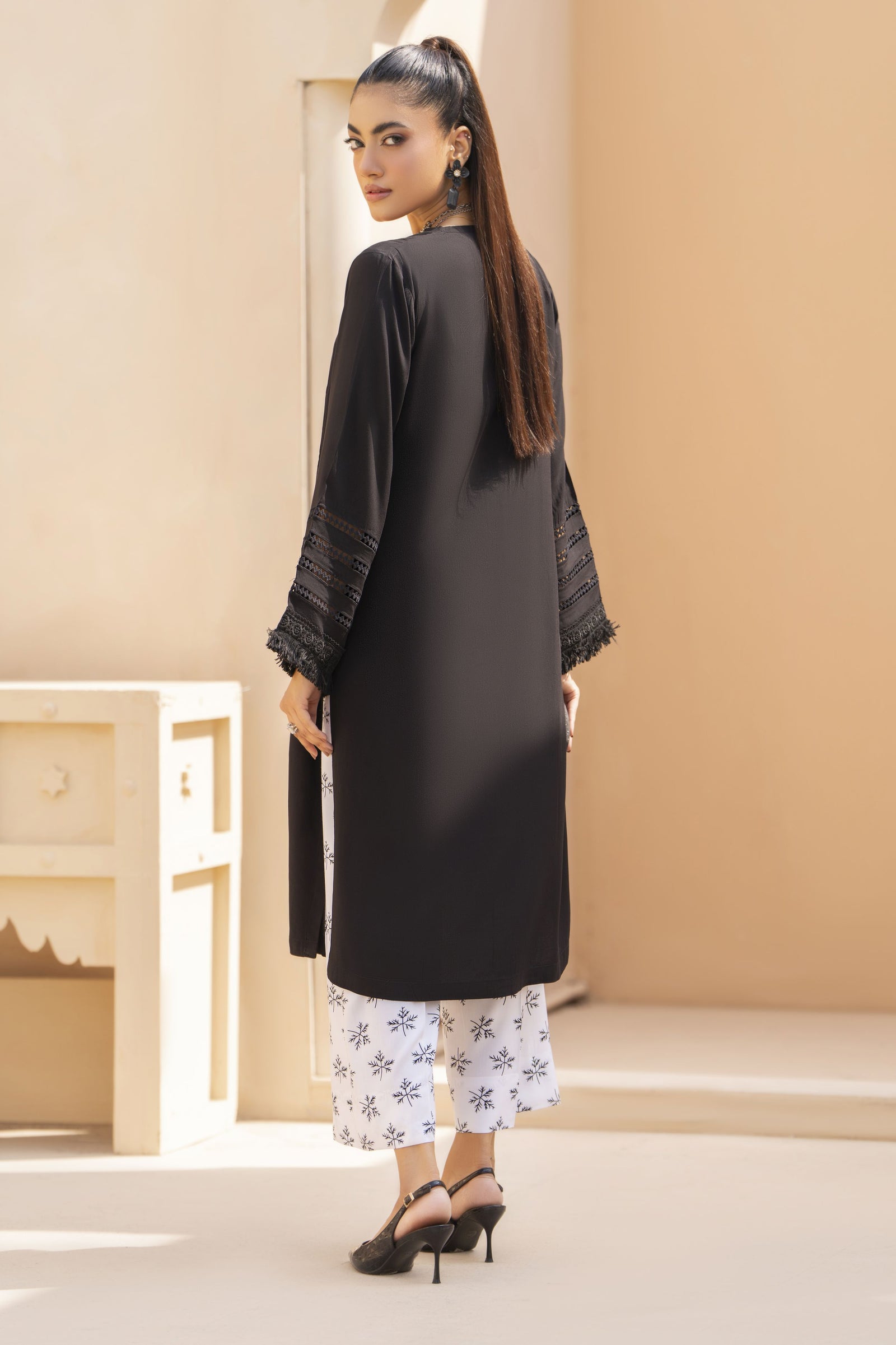 Exude refined elegance with this 2-piece ready-to-wear linen outfit from Linen Drop by Gul Warun. The black shirt features a sleek straight cut with crystal-style buttons and intricate lace detailing on the sleeves, adding a hint of glamour to the minimalist design. Paired with printed white trousers in a subtle black floral pattern, this ensemble is perfect for winter gatherings, casual outings, or sophisticated everyday wear.