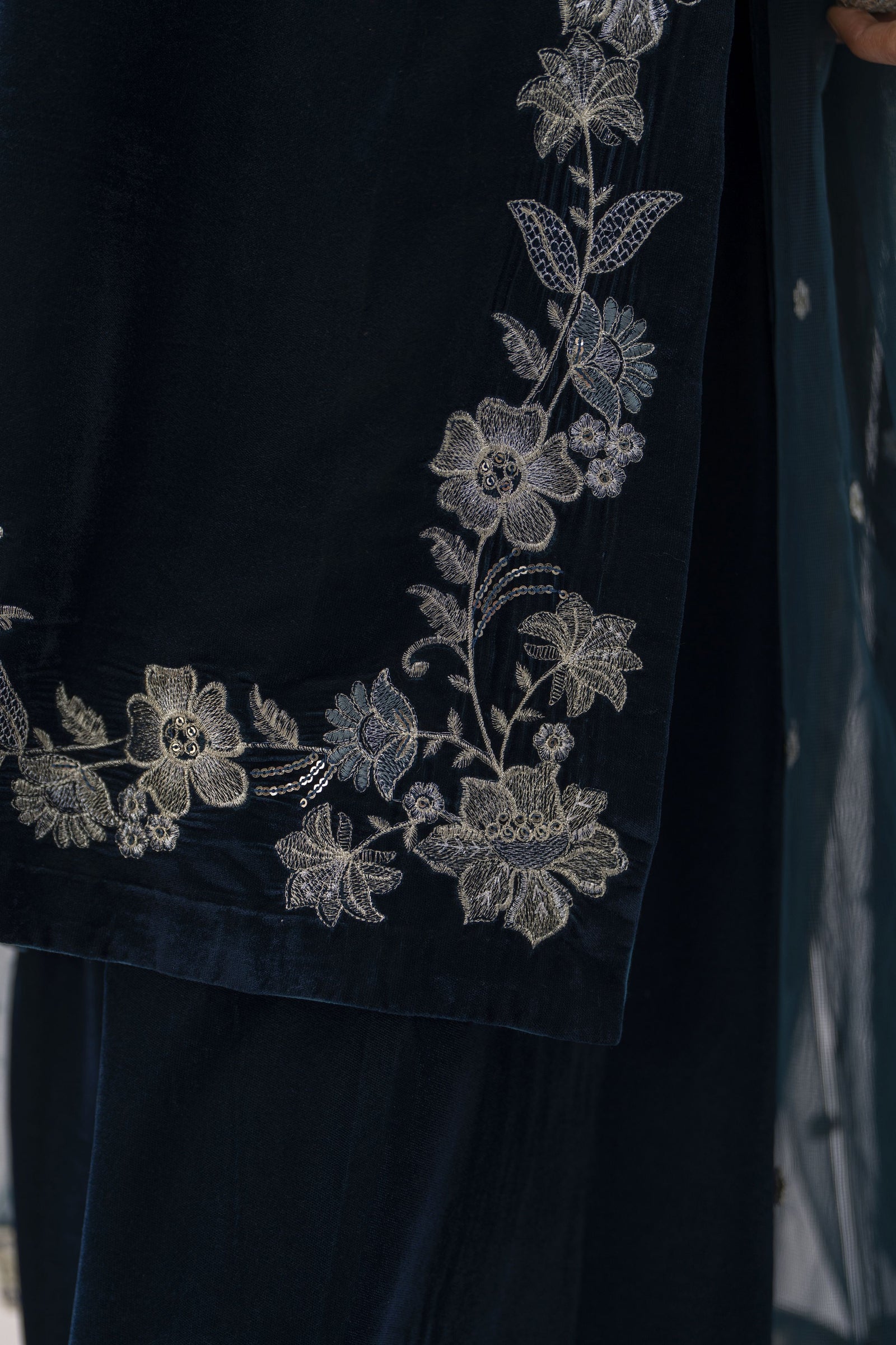 This elegant navy blue velvet outfit from Makhmal by Gul Warun is the perfect blend of sophistication and winter luxury. The rich velvet shirt is beautifully decorated with thread and sequin embroidery, giving it a refined shimmer that catches the light without feeling too loud. Paired with wide-leg velvet trousers, the silhouette feels graceful, flowy and effortlessly comfortable — ideal for evening wear. The look is finished with a soft embroidered net dupatta, adding a delicate contrast to the deep velvet tones. Whether you’re dressing up for a winter dinner, a festive gathering or a special occasion, this 3-piece suit delivers classic charm with a modern, polished feel.