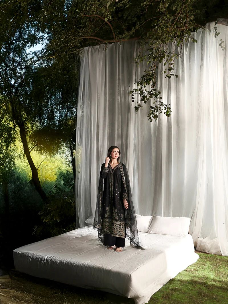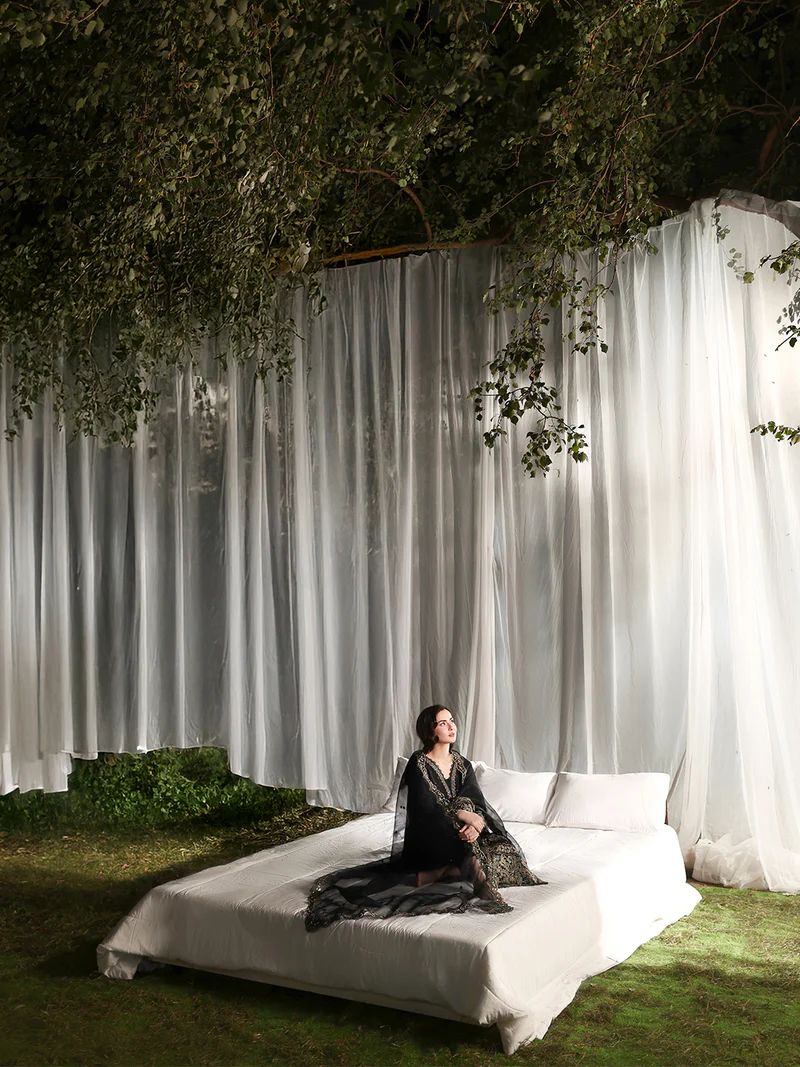 Elevate your Eid wardrobe with timeless black elegance from Hania’s Eid Twinning Charm by Mona. This luxurious chikankari jacquard ensemble is intricately adorned with luminous 5mm spangle embroidery and detailed handcrafted adda work, creating a look that is refined, regal and unforgettable.
