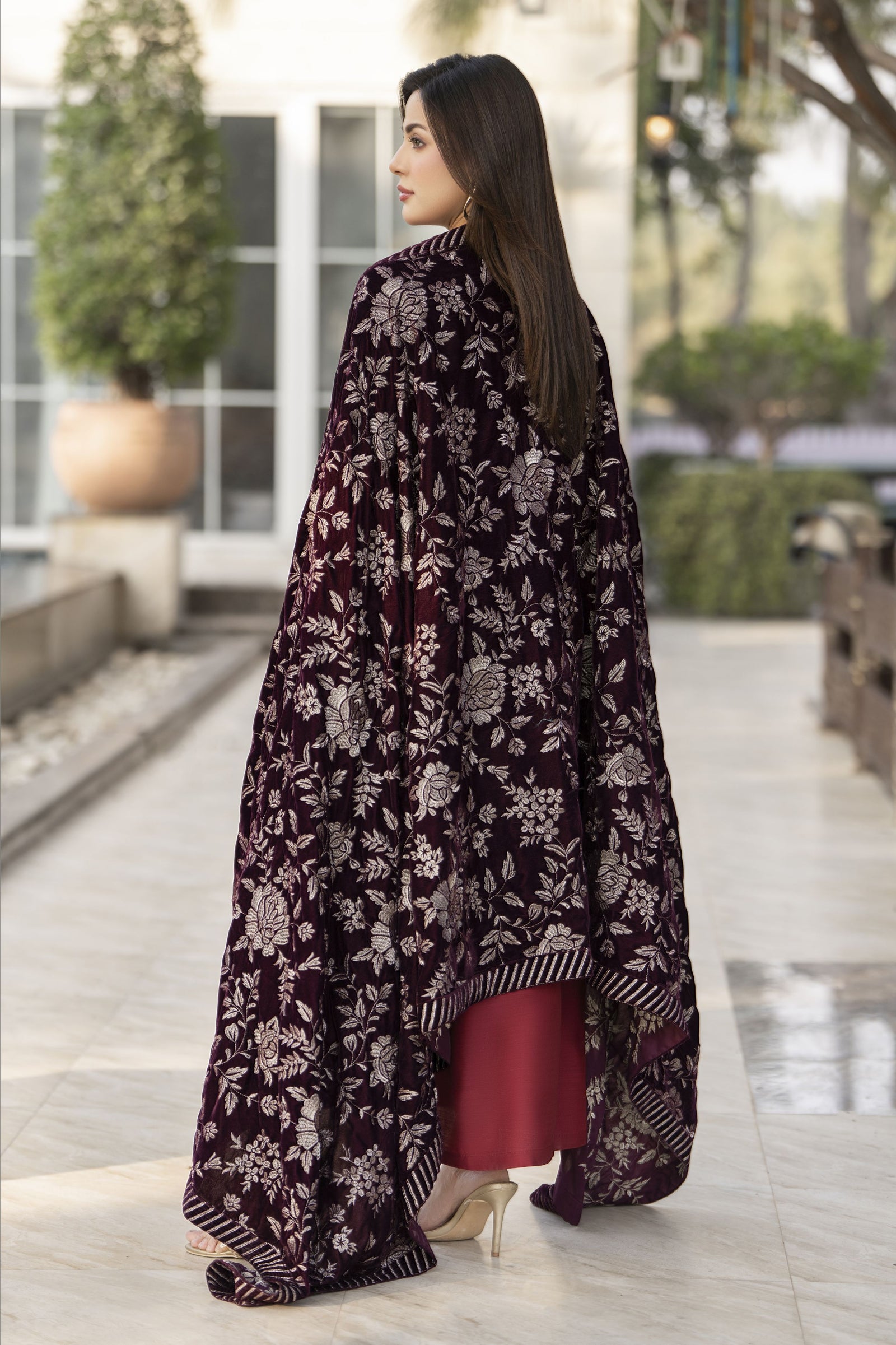 Wrap yourself in winter elegance with this luxurious embroidered velvet shawl in a rich deep maroon shade. Crafted from soft, plush velvet, this shawl features all-over floral embroidery that adds depth, texture, and a refined traditional touch.