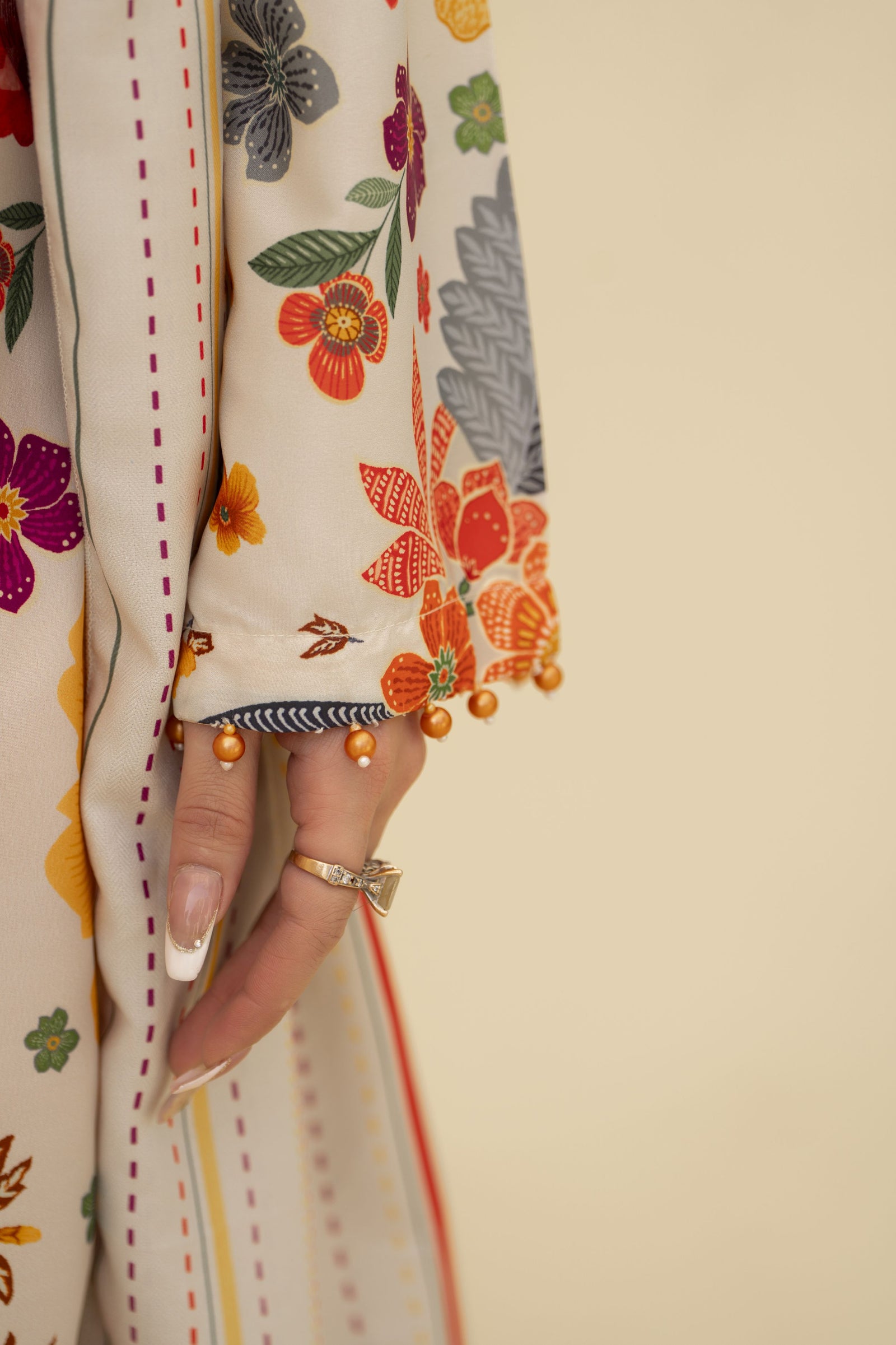 A vibrant winter ensemble featuring a beautifully printed grip shirt paired with matching wide-leg trousers for an effortlessly graceful silhouette. The outfit is completed with a premium double-sided herringbone printed shawl, adding refined warmth and texture to your seasonal wardrobe.