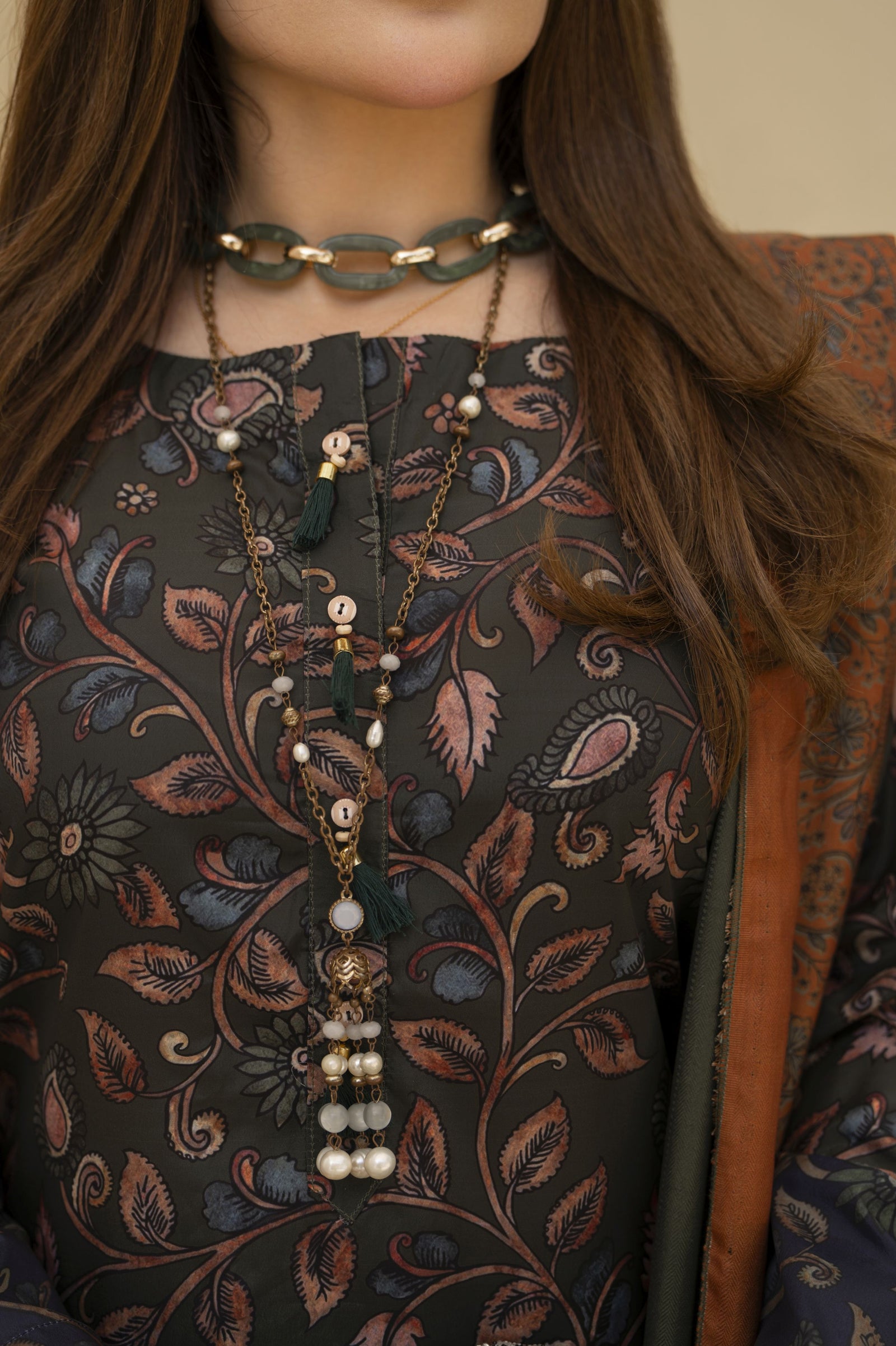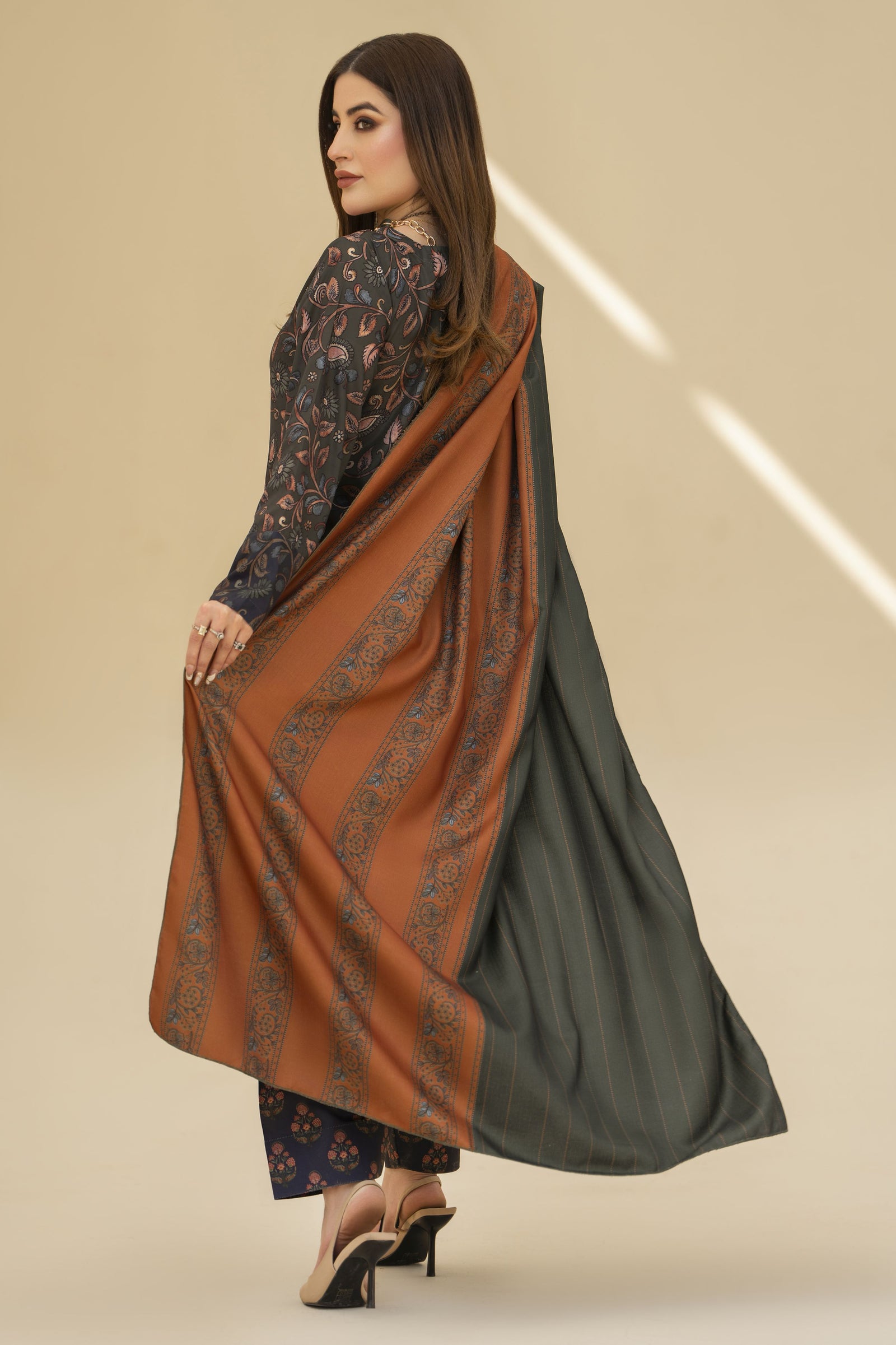 The outfit is elevated with a double-sided printed herringbone shawl in warm rust and teal shades, offering a beautiful contrast while keeping you cosy during the season. Perfect for everyday wear, office styling, or casual gatherings with a graceful winter touch.