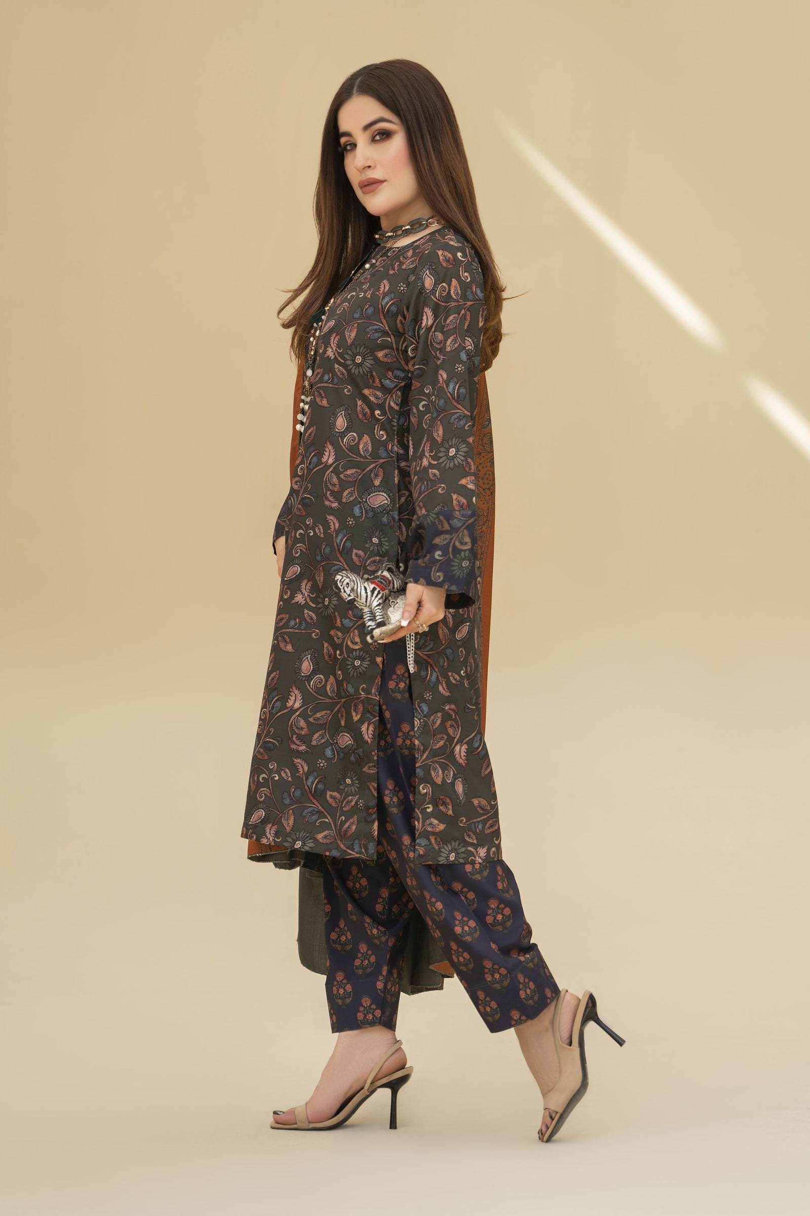 A rich green winter ensemble adorned with elegant botanical patterns, crafted on soft and comfortable printed grip fabric. The shirt features a refined floral vine design in earthy tones, paired with a classic printed shalwar for a traditional yet stylish winter look.