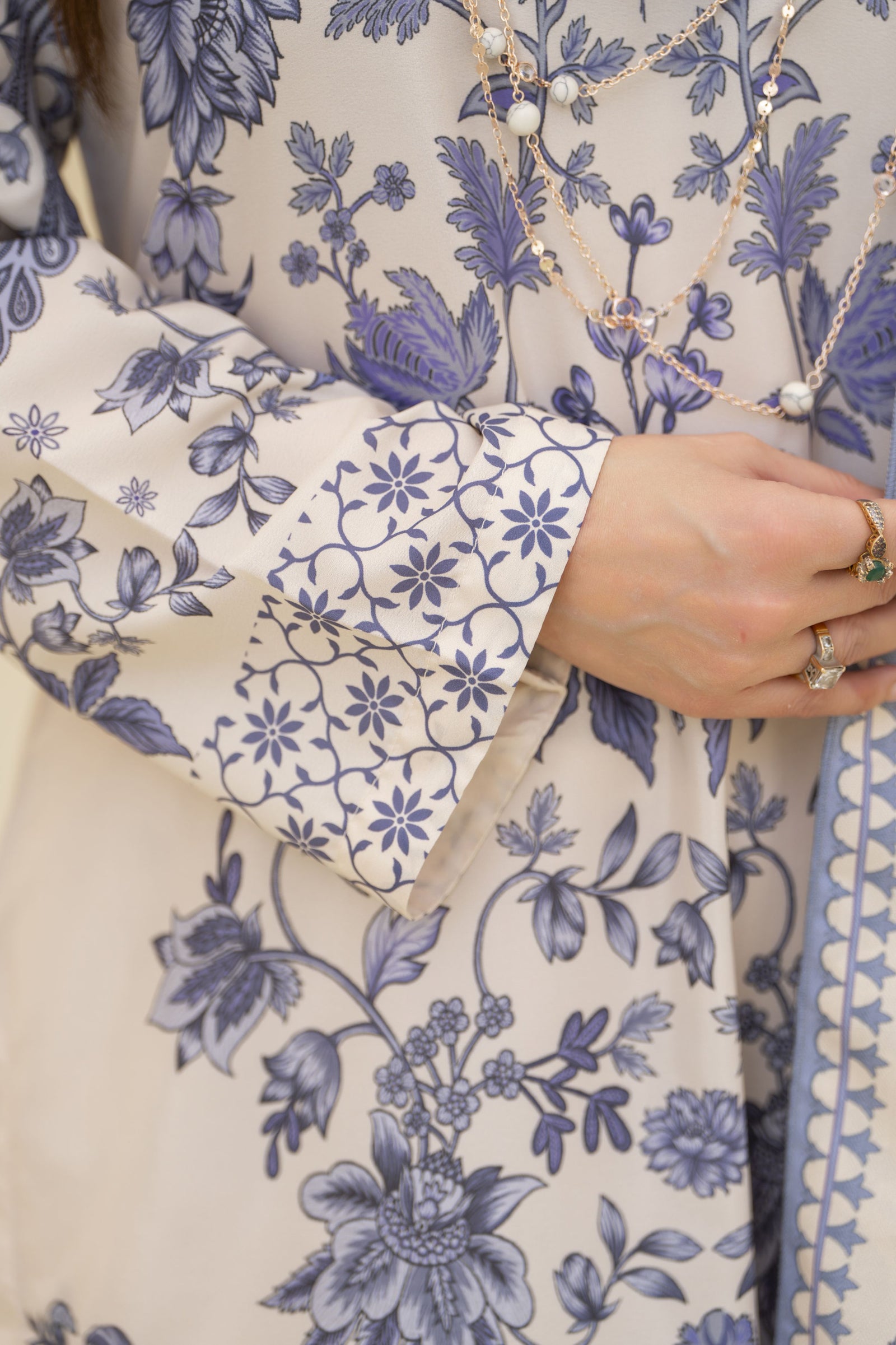 A soft, refreshing winter outfit designed in soothing ivory and blue tones, featuring a beautifully detailed printed grip shirt with elegant floral artistry. The long, flowing silhouette gives a graceful fall, paired with straight-leg printed trousers for a polished and refined look.