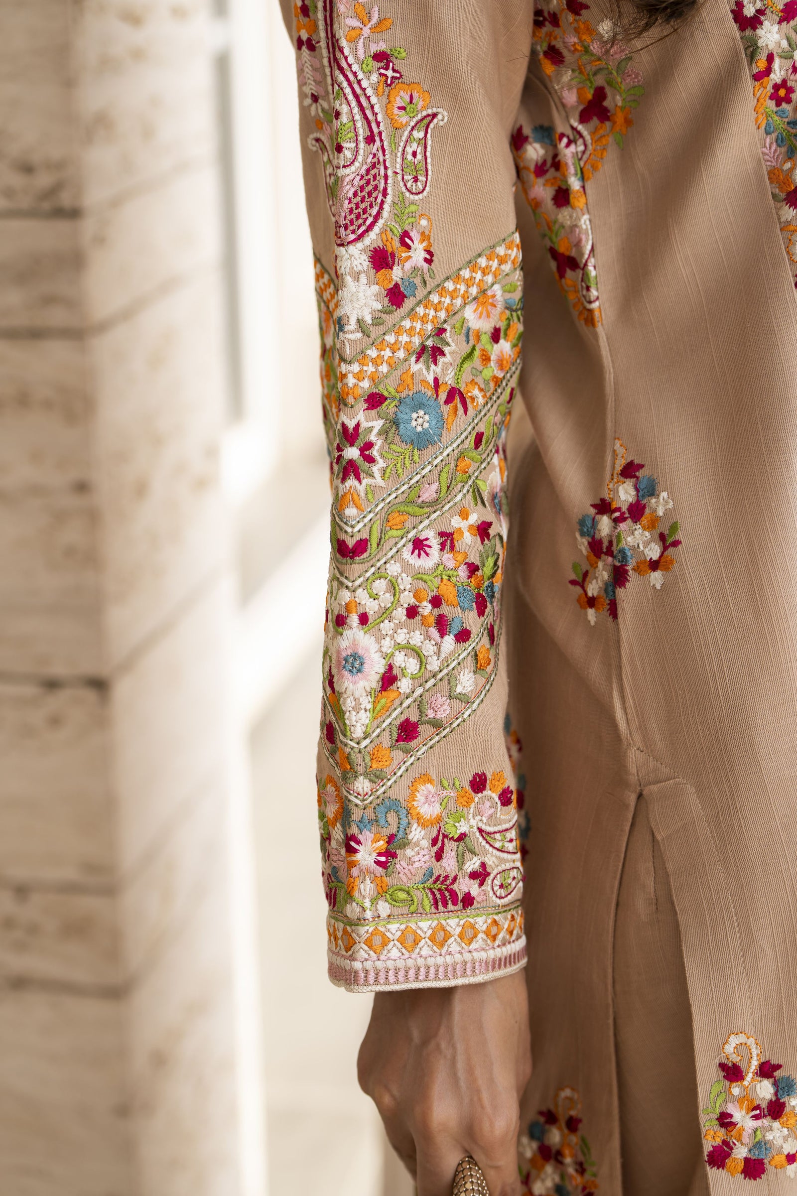 Step into effortless winter elegance with this beautifully crafted 2-piece khaddar suit from Zaiwa’s Winterlite collection. The warm khaddar shirt is adorned with intricate multicolour embroidery and delicate mirror work, creating a soft yet eye-catching winter look. Paired with matching straight-leg trousers, this outfit offers comfort, style, and a refined silhouette perfect for everyday wear, casual outings, or winter gatherings. Designed for women who appreciate detail and cosy seasonal dressing.