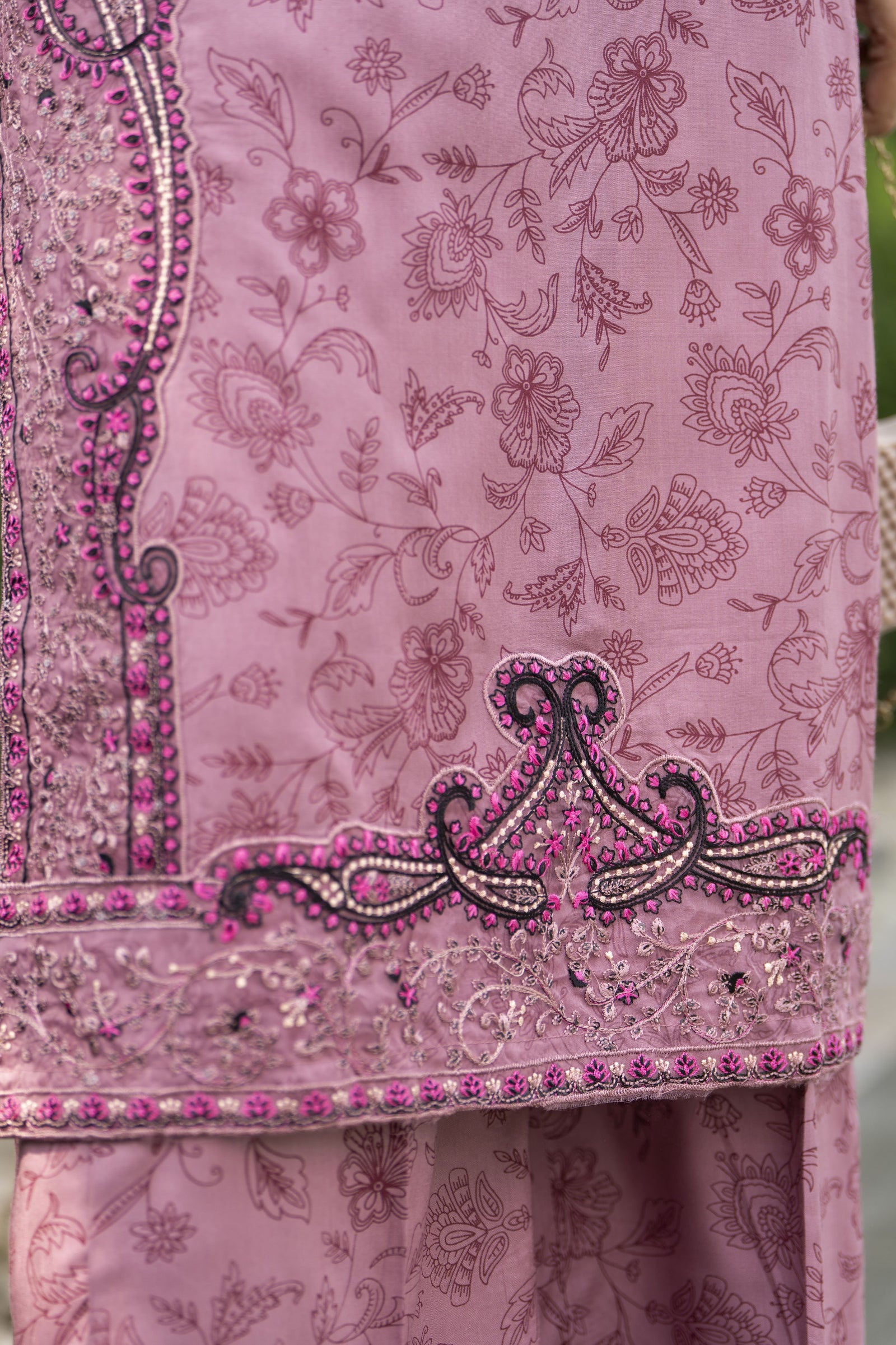 A soft winter look with a touch of elegance, this 2-piece linen suit features a beautifully printed base enriched with delicate thread embroidery along the neckline, sleeves, and hem. The subtle floral pattern is complemented by deeper embroidered accents, adding dimension and charm without overpowering the outfit. The wide-leg printed trousers complete the coordinated silhouette, making this a graceful yet comfortable choice for casual winter wear, lunches, and relaxed gatherings.