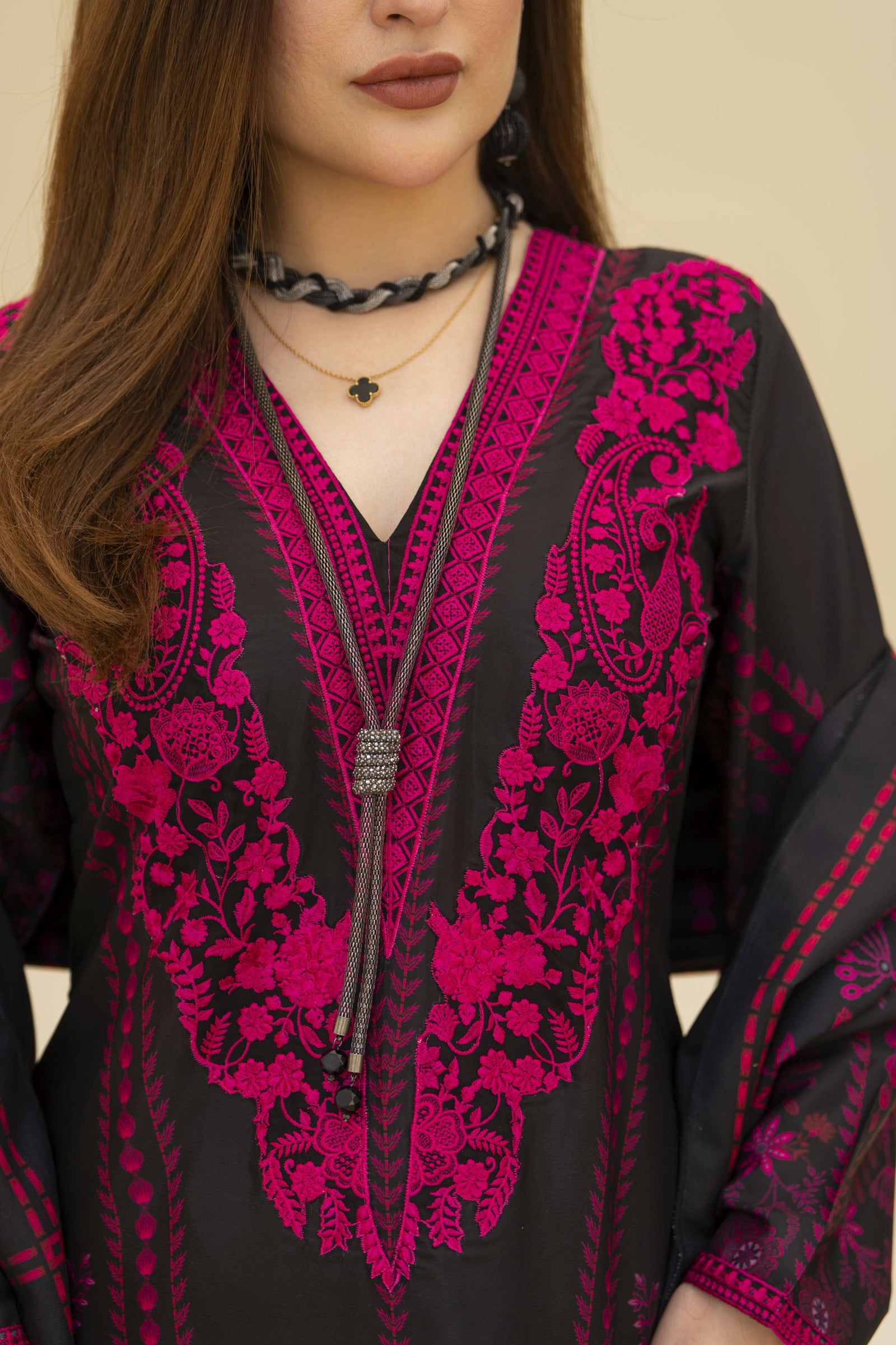 A striking winter ensemble crafted on a deep black base, elevated with vibrant pink embroidery and intricate printed detailing. The shirt features a beautifully embroidered neckline and front panel, adding a luxurious and refined touch to this bold seasonal look. Paired with wide-leg printed trousers, the outfit offers comfort with a statement edge.
