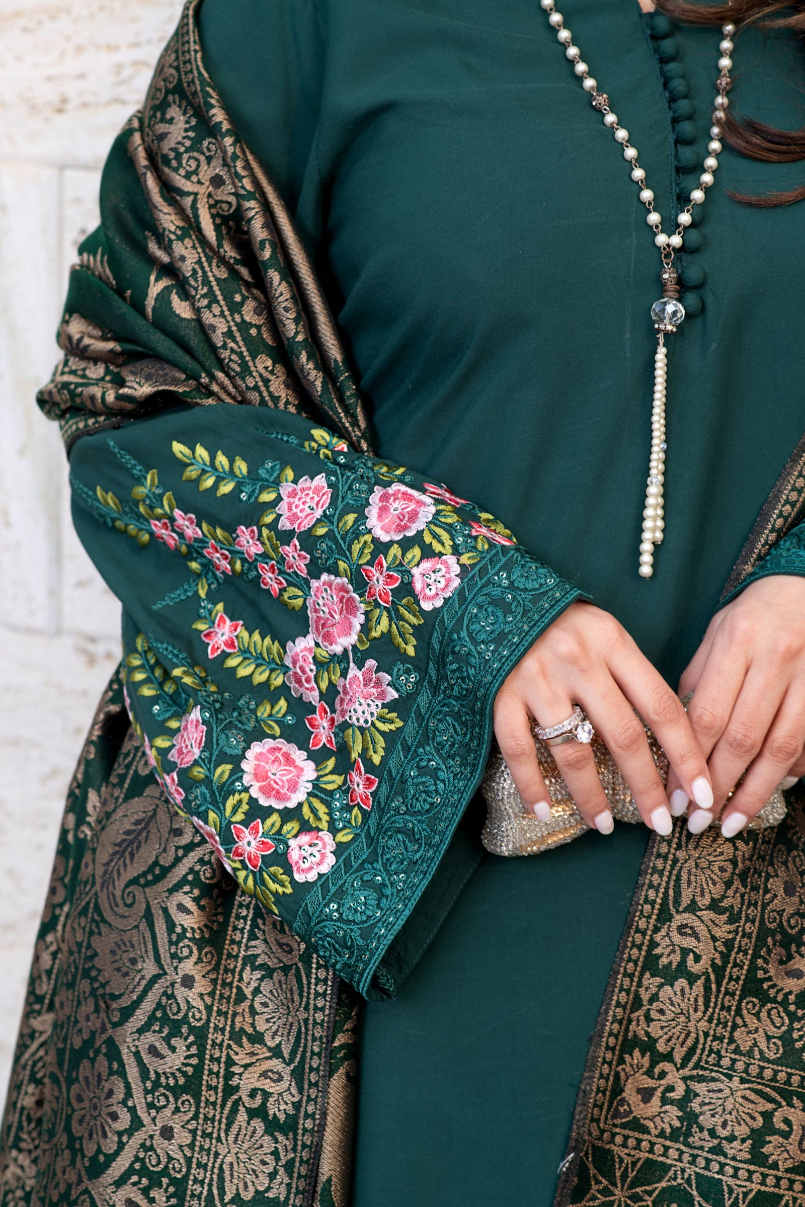 Paired with wide-leg embroidered trousers, the outfit offers both comfort and a statement finish, ideal for women who prefer elevated winter styling. The look is completed with a Multani jacquard winter shawl, known for its intricate woven patterns and warm texture, bringing depth, tradition, and seasonal richness to the ensemble.