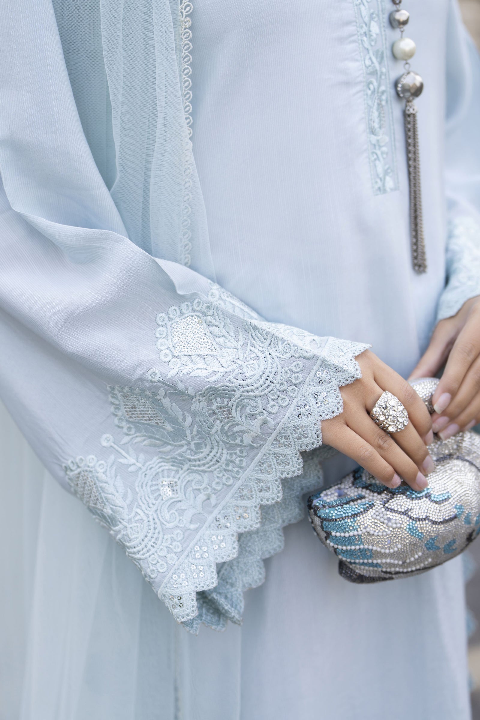 The outfit features an embroidered long shirt, detailed with delicate embroidery that enhances the design while maintaining a minimal and sophisticated look. The longer length creates a modest, flattering silhouette, making it ideal for women who prefer timeless Pakistani fashion that feels light and easy to wear rather than heavily embellished.