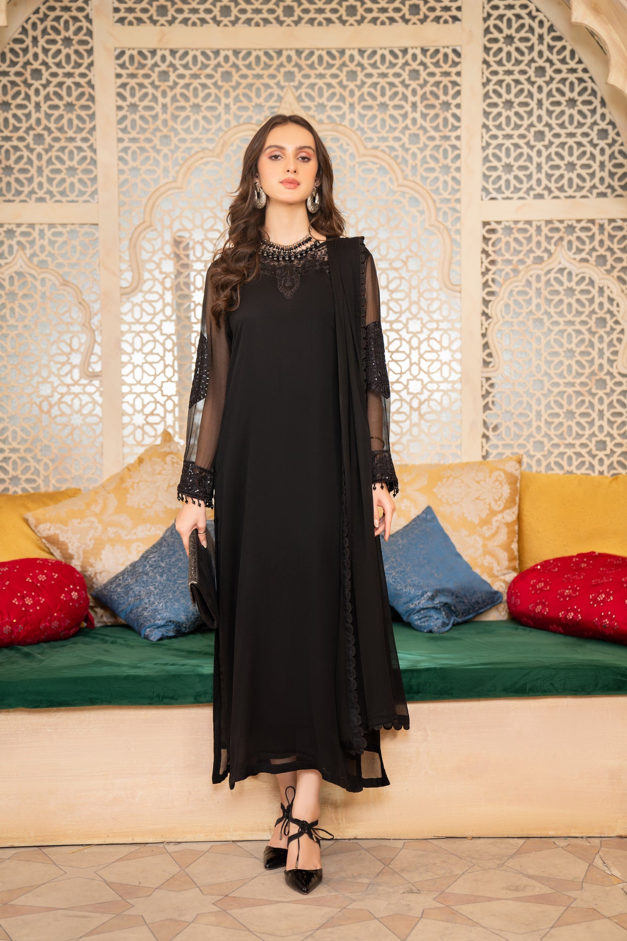 3pc Ready to Wear formal Black chiffon embroidered long shirt with chiffon lace detailed dupatta and grip trousers.