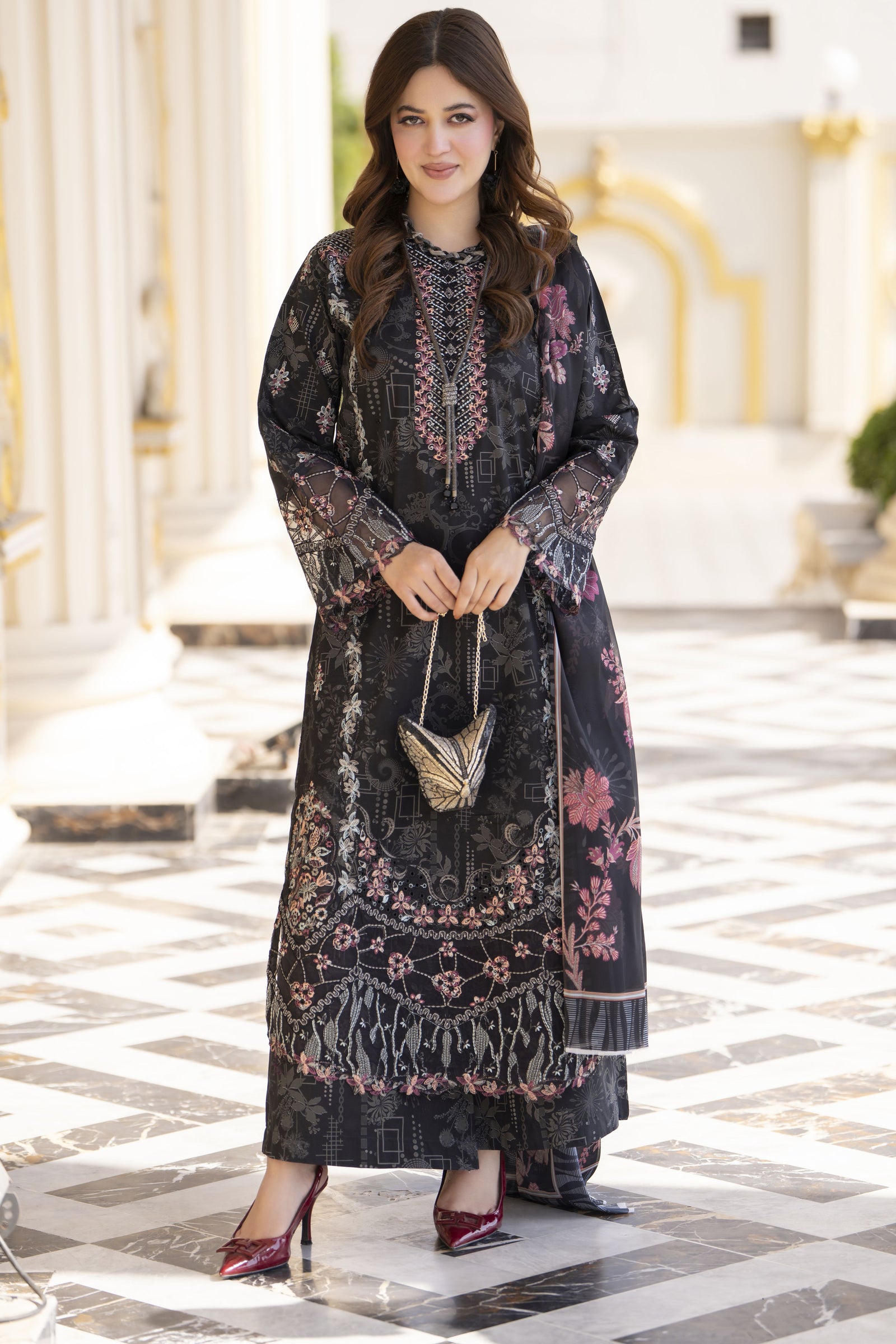 Bold, timeless, and effortlessly striking — this black outfit from Khushi by Silver is designed to make a lasting impression. Crafted in breathable cotton, this 3 piece Pakistani ready to wear suit features intricate thread and sequin embroidery that stands out beautifully against the deep black base.