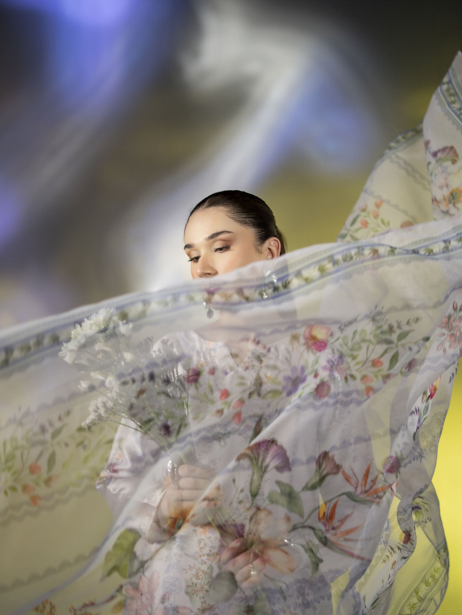 Paired with coordinated digitally printed silk trousers, this ensemble offers comfort alongside a clean, polished silhouette. The look is completed with a lightweight printed chiffon dupatta, adding a fluid and airy finish without overwhelming the outfit. Ideal for day-to-day wear or relaxed occasions, this set balances premium fabric with easy elegance.
