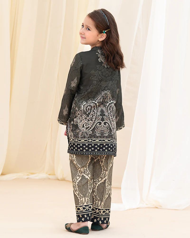 Mona Pretty Prints Girls 2pc Poly Raw Silk Co-ord Set Black & Beige Printed KMES8