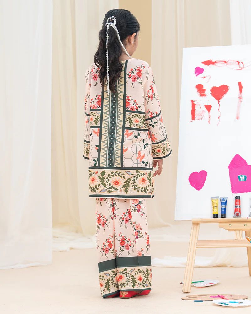 Mona Pretty Prints Girls 2pc Poly Raw Silk Co-ord Set Peach Floral Printed KMES9