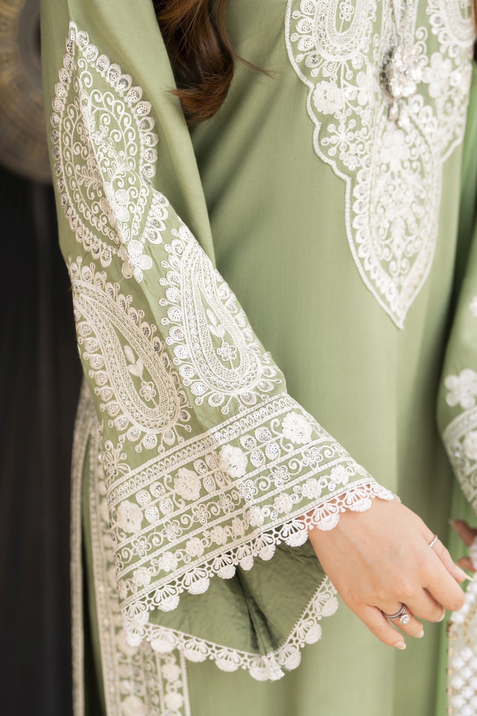 Graceful and timeless, this 3-piece embroidered linen outfit from Linen Aura by Miski captures the soft elegance of winter fashion. The pistachio green shirt features intricate ivory embroidery across the neckline, sleeves, and hem, highlighted with delicate lace accents that elevate its refined aesthetic. The long silhouette and airy fabric ensure both comfort and sophistication, while matching trousers add a polished finish. A chiffon dupatta detailed with lace edging completes the ensemble, creating a balanced look of luxury and warmth. Perfect for day events, semi-formal gatherings, or elegant evening wear, this piece is a statement of understated beauty.