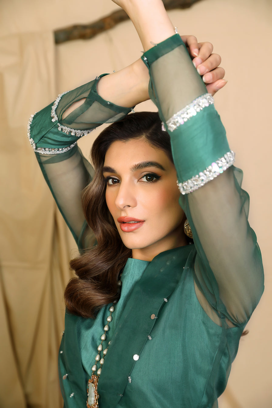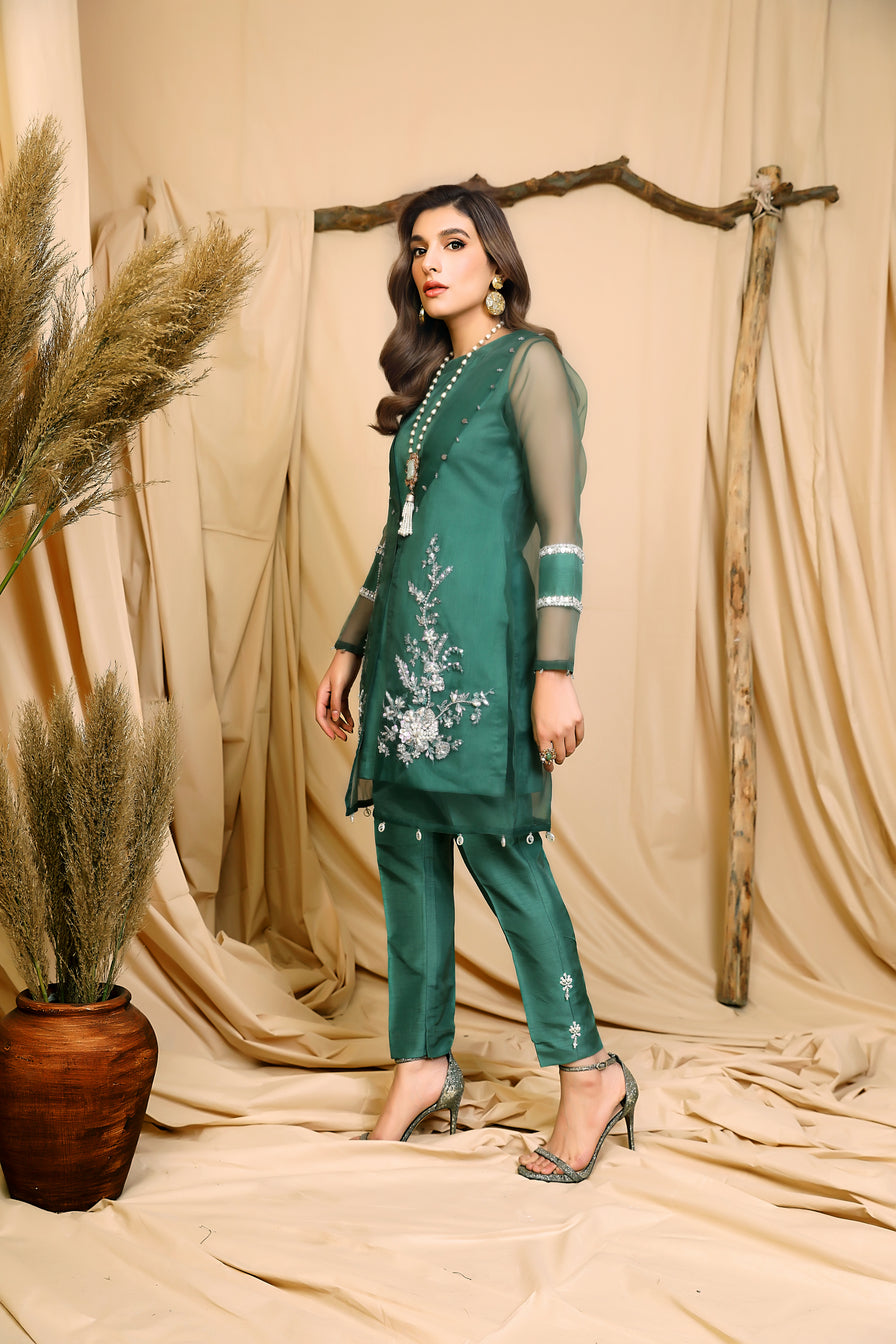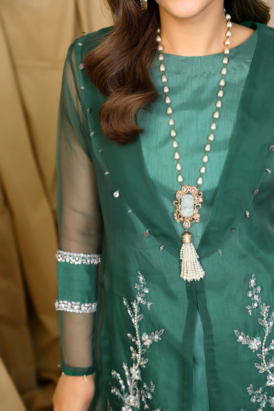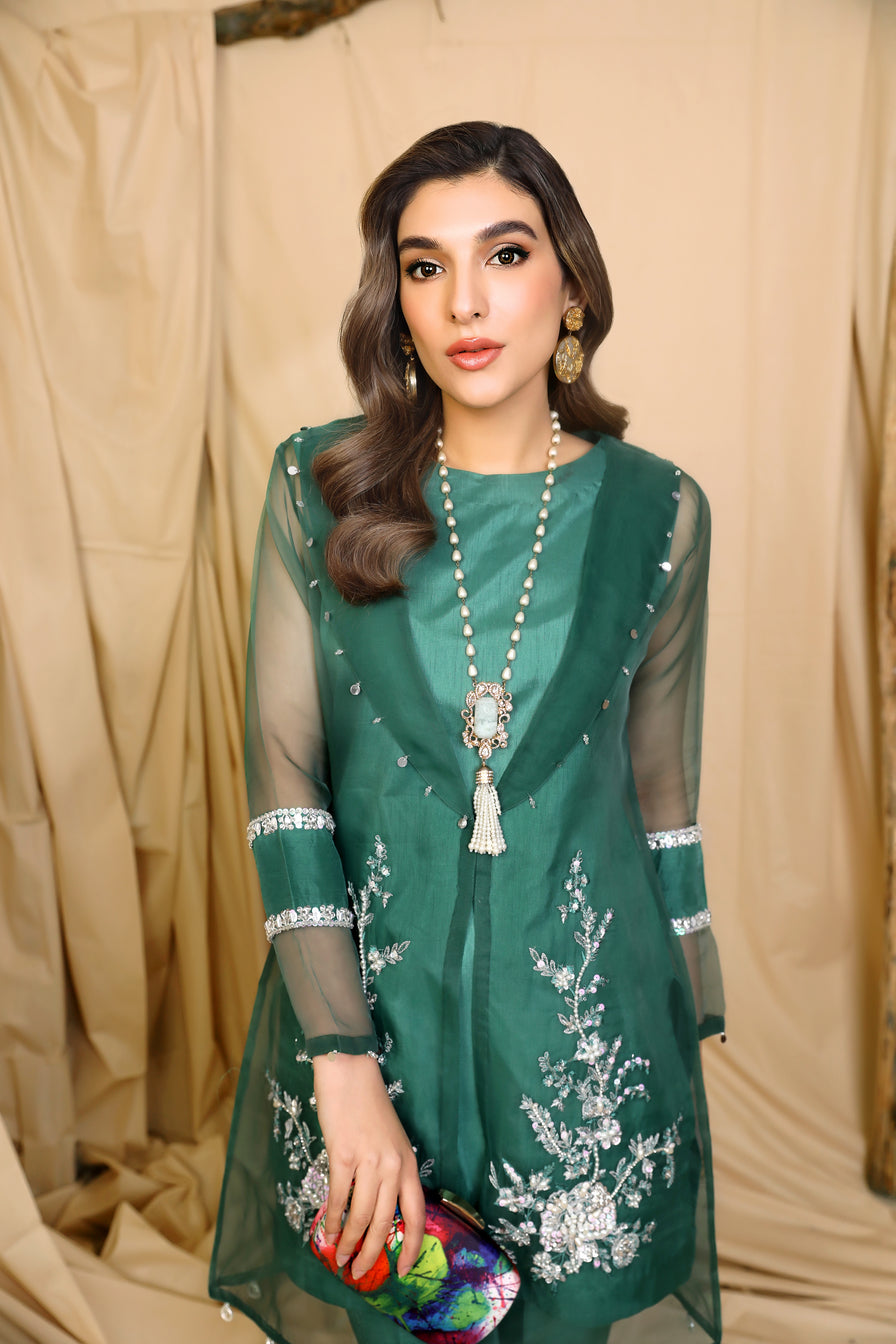 3pc Ready to Wear formal organza embroidered gown with handwork paired with korean raw silk trousers. It comes with separate korean raw silk slip.