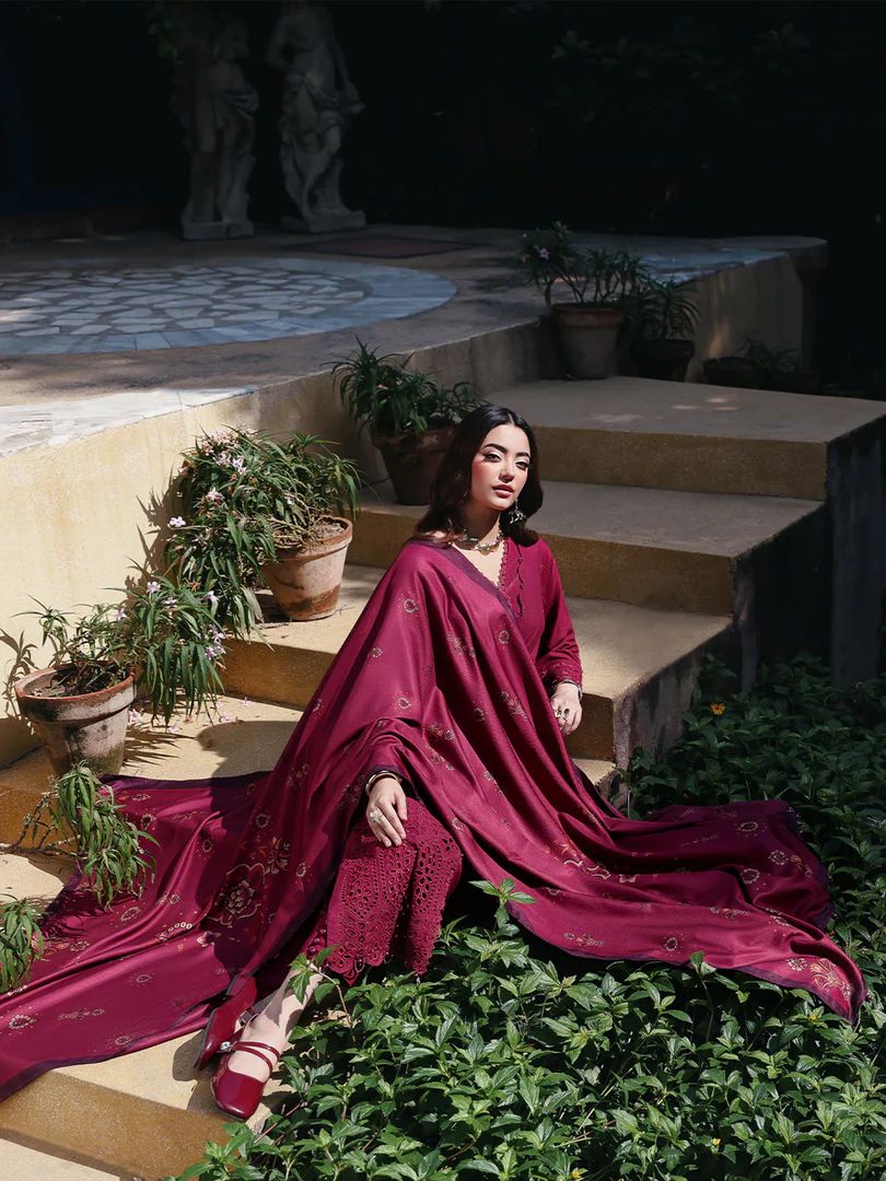 A graceful blend of heritage craftsmanship and winter elegance, this 3-piece ready-to-wear suit from Resham by Mona is designed for timeless sophistication.