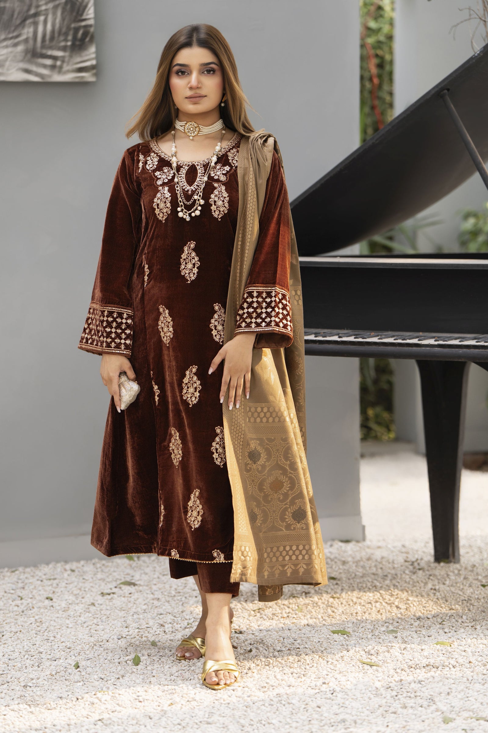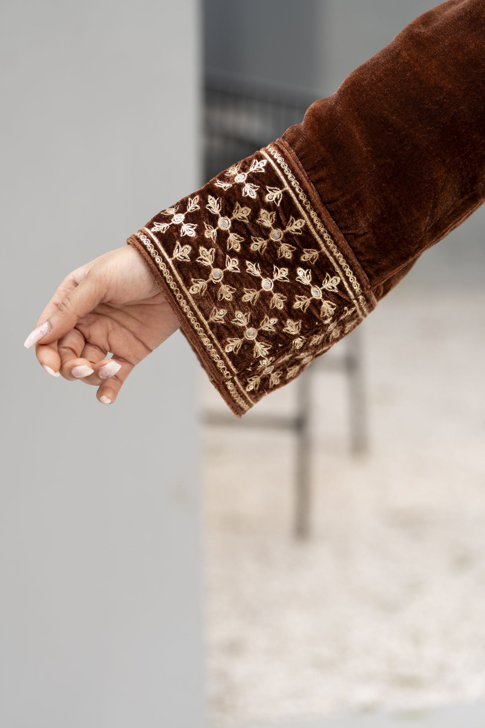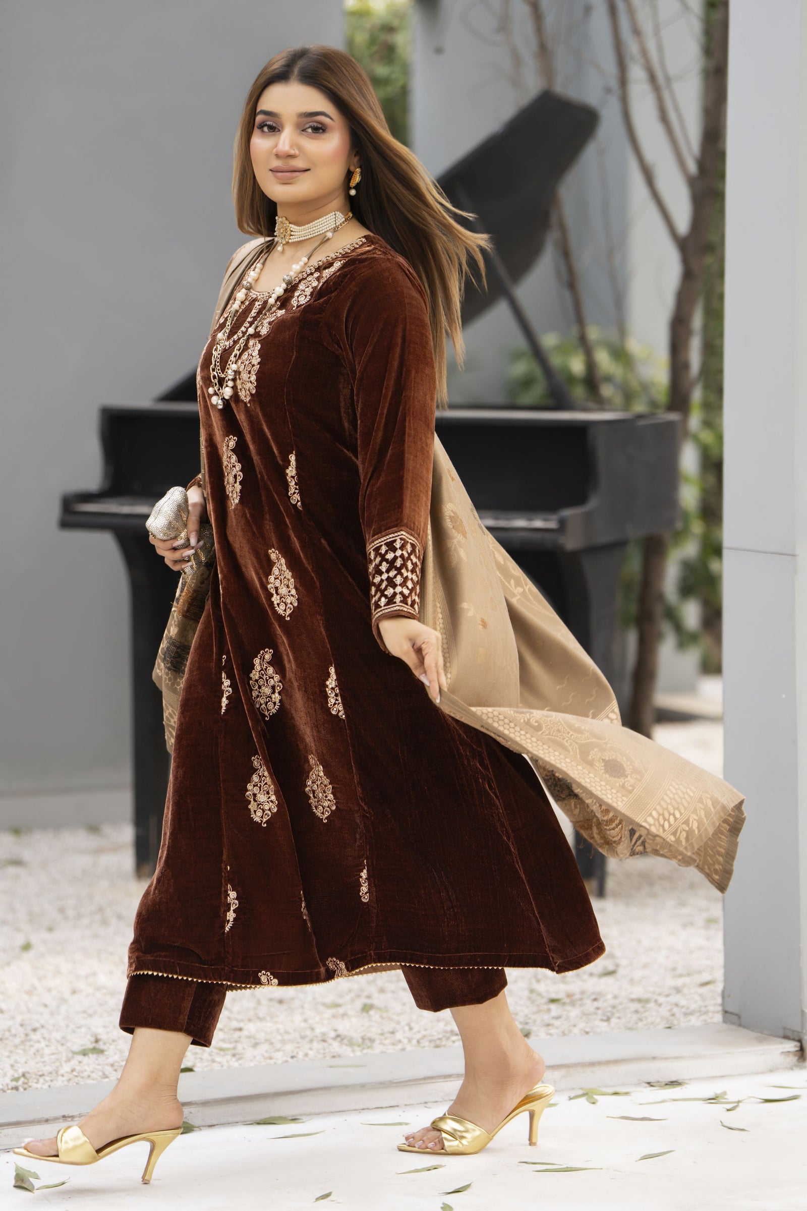 Rich and refined, Tara from the Zaina Plush collection is designed for elegant winter dressing. Crafted in luxurious brown velvet, this A-line long shirt with closed slits is adorned with delicate embroidery and paired with a statement Multani wool jacquard shawl for a timeless, regal finish.